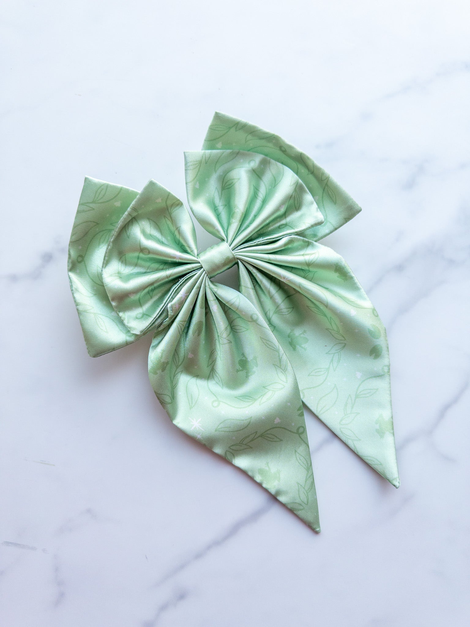 Large satin bow with 3 inch barrette on back. Bow with tails is 8 inches wide and 10 inches long.