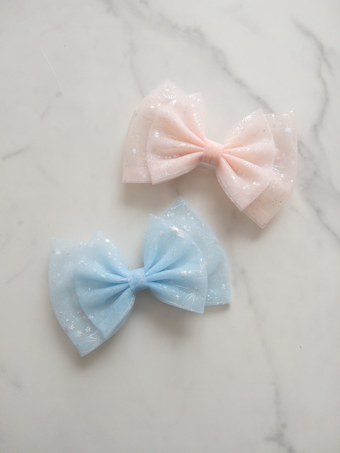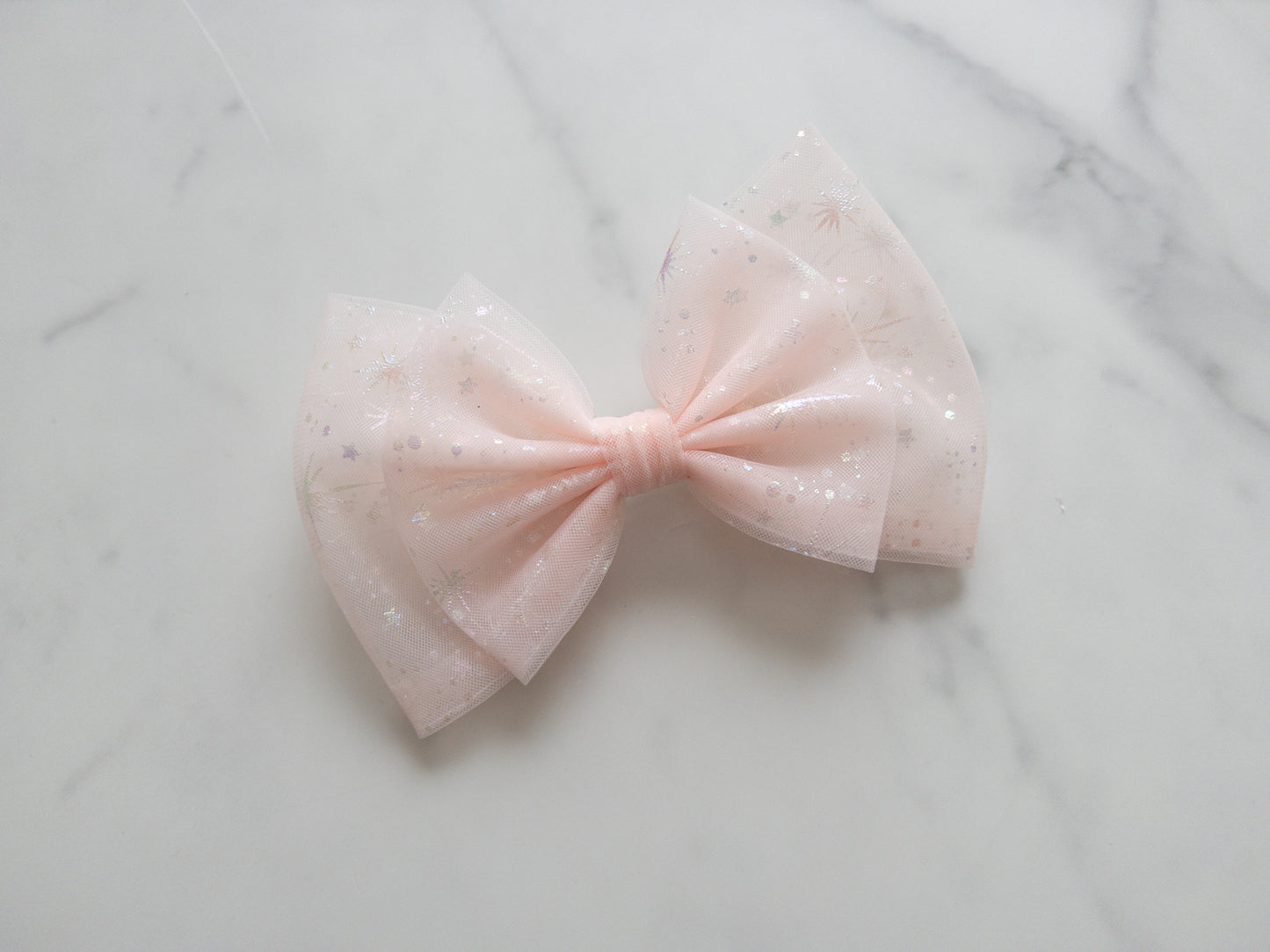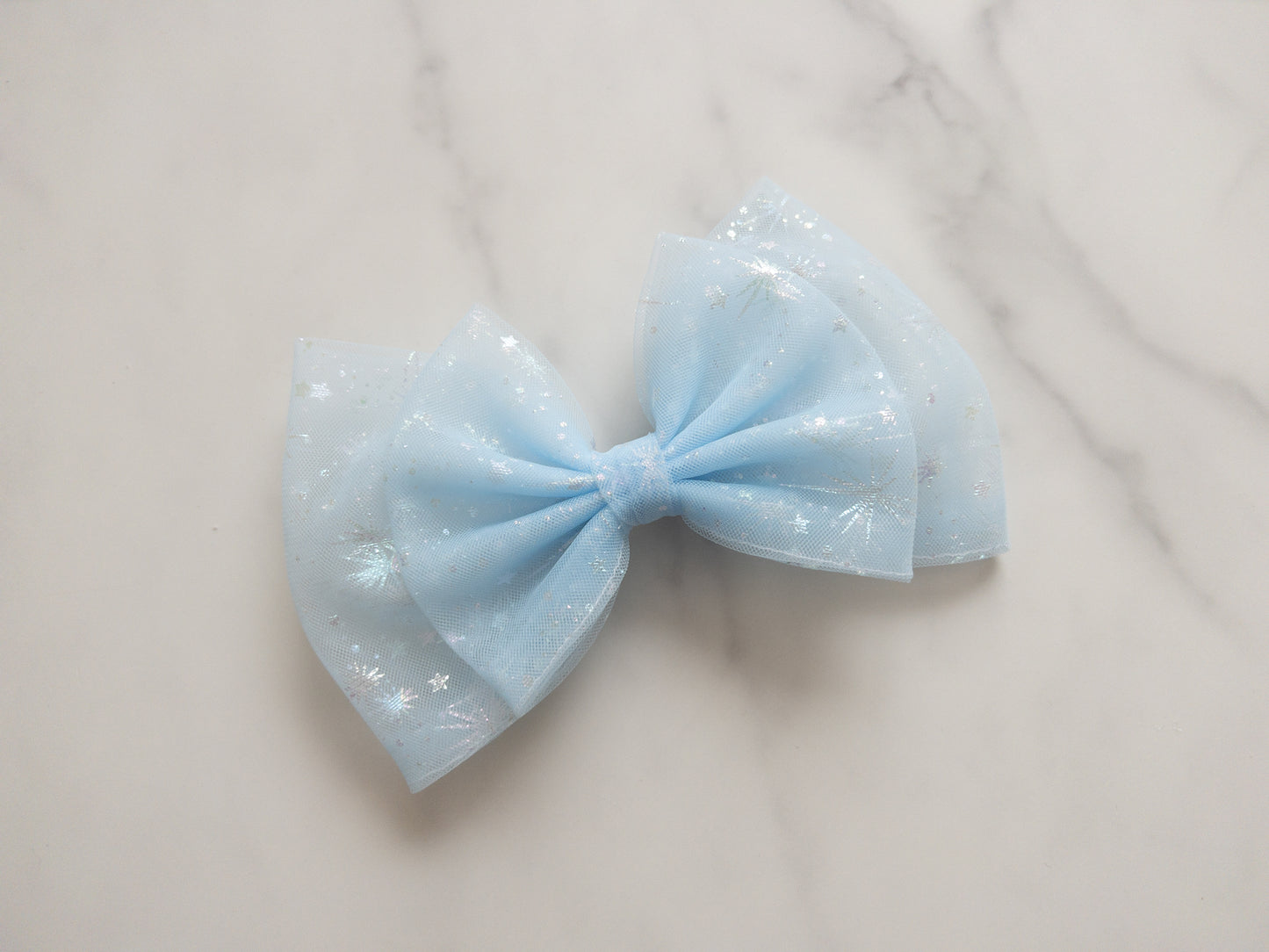 Tulle hair bow with a barrette. Bow is about 6 inches in width and 4 inches in height.