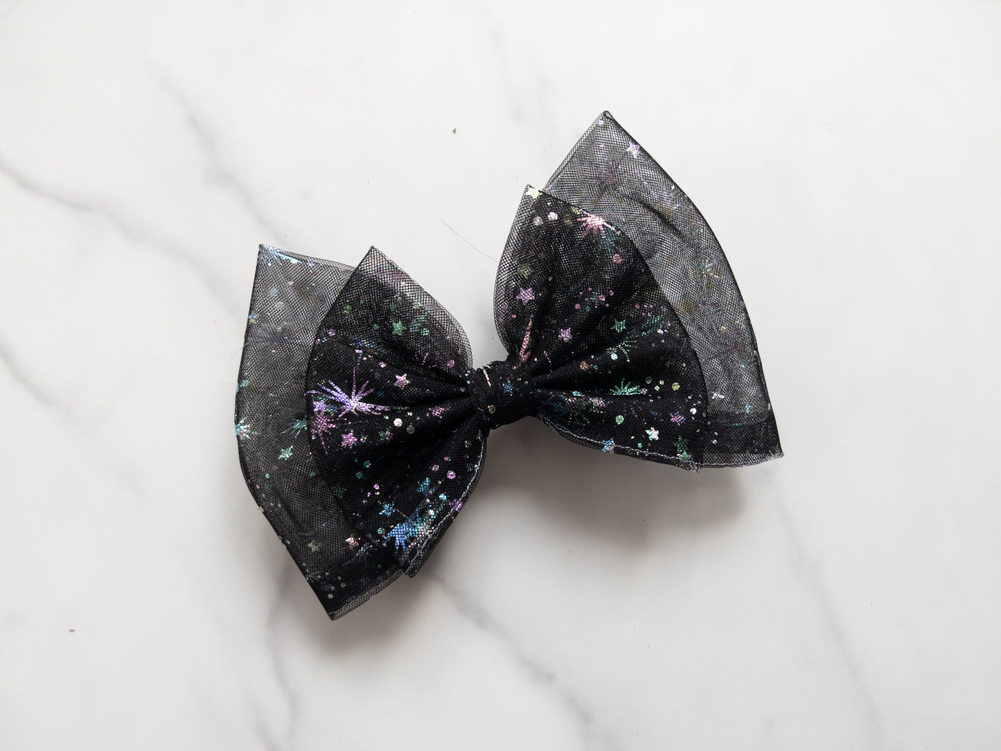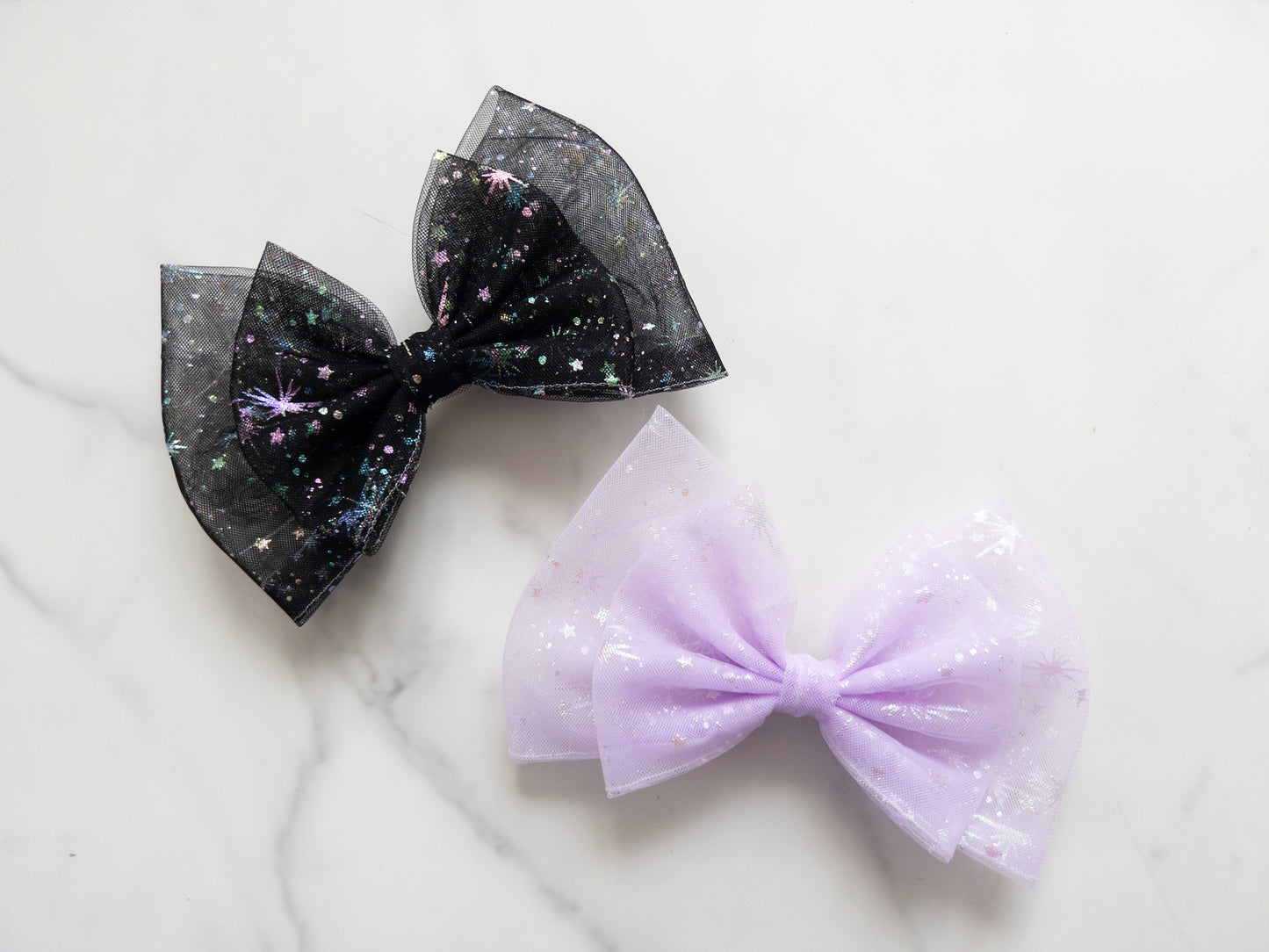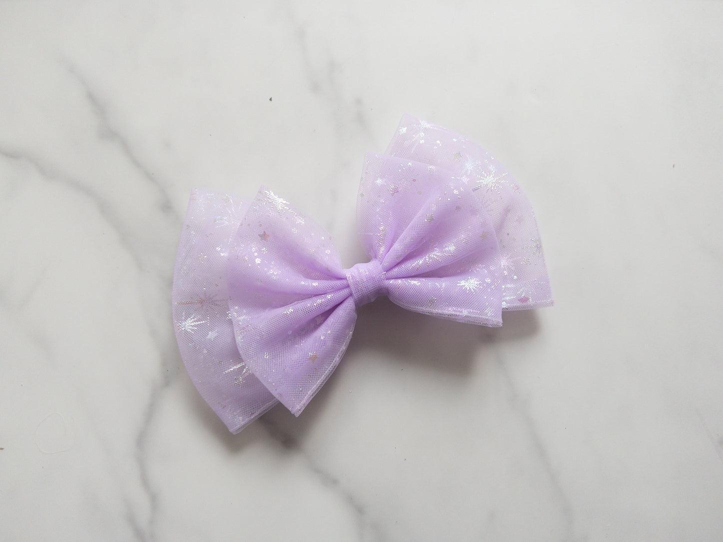 Tulle hair bow with a barrette. Bow is about 6 inches in width and 4 inches in height.