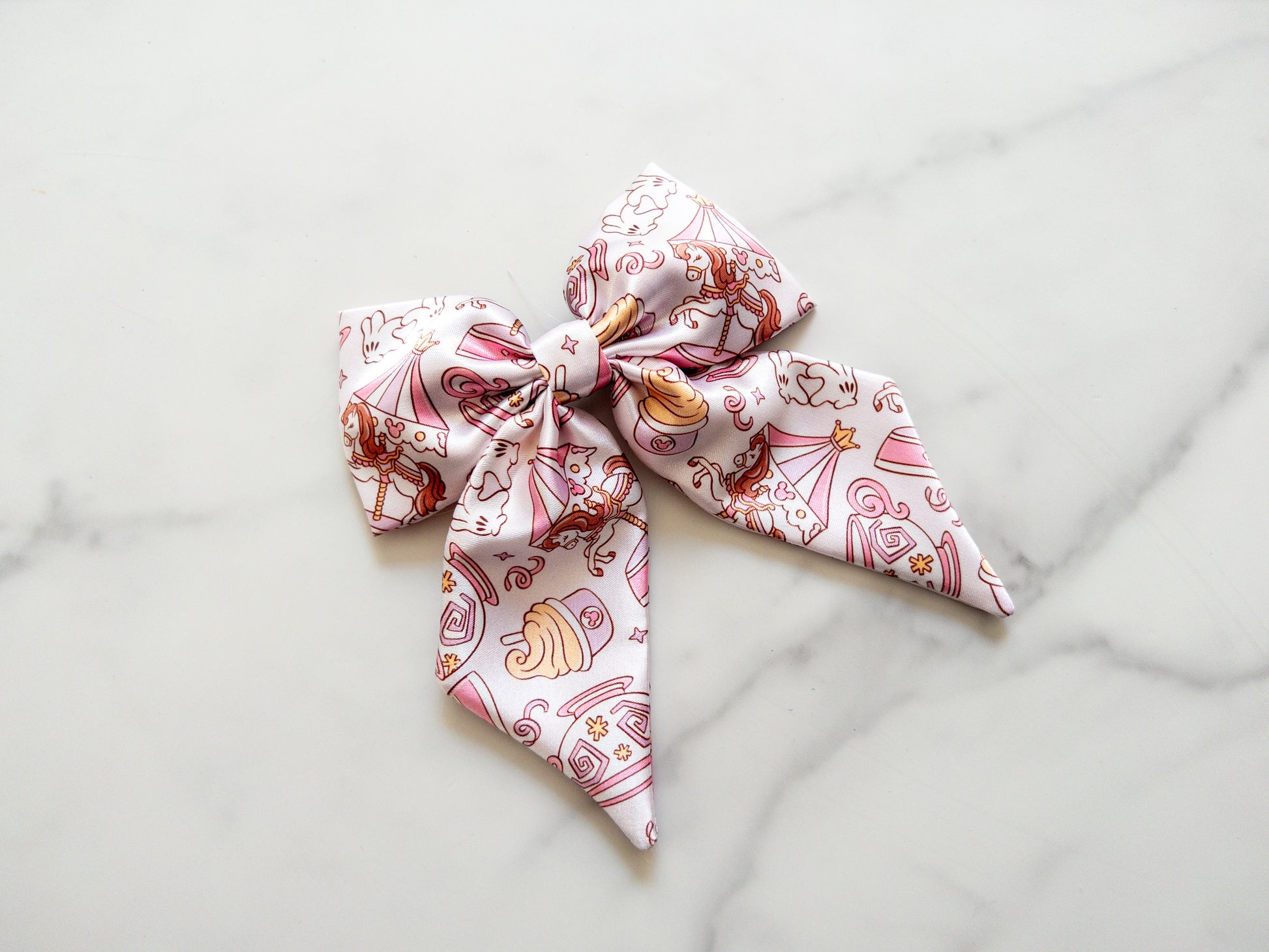 Bow is about 5.5 inches wide with tails. Back has a 3 inch barrette.
