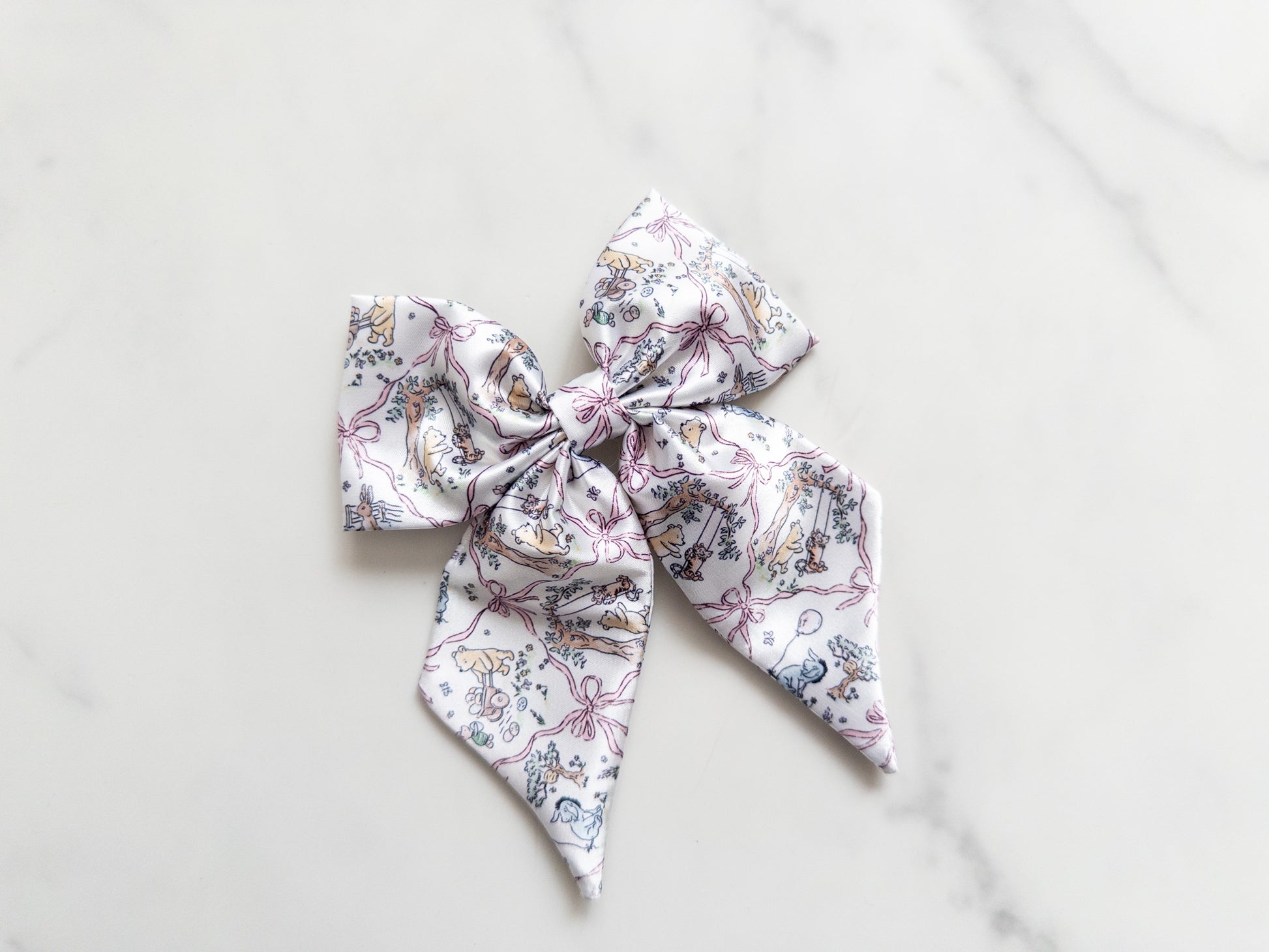 Bow is about 5.5 inches wide with tails. Back has a 3 inch barrette.