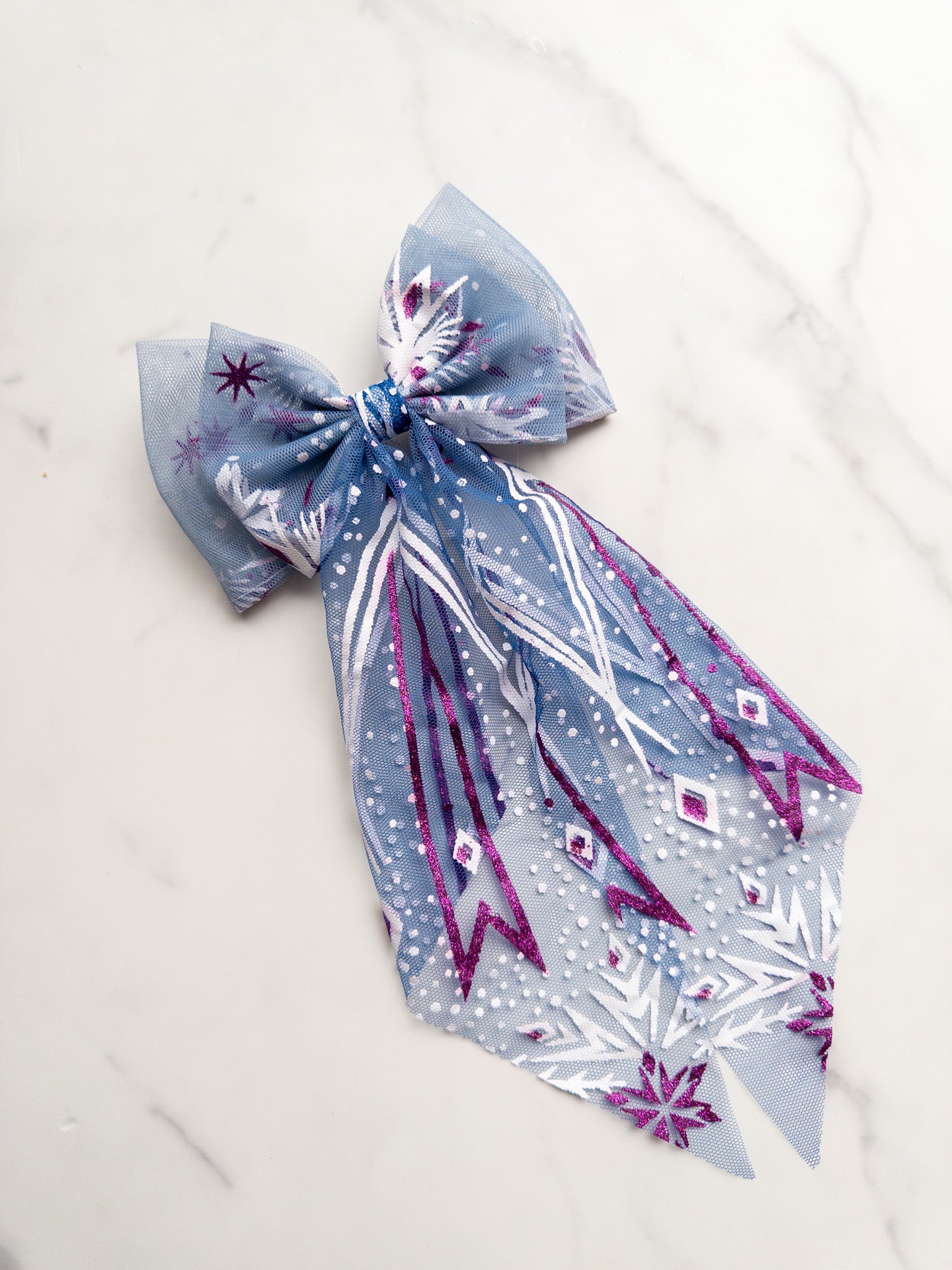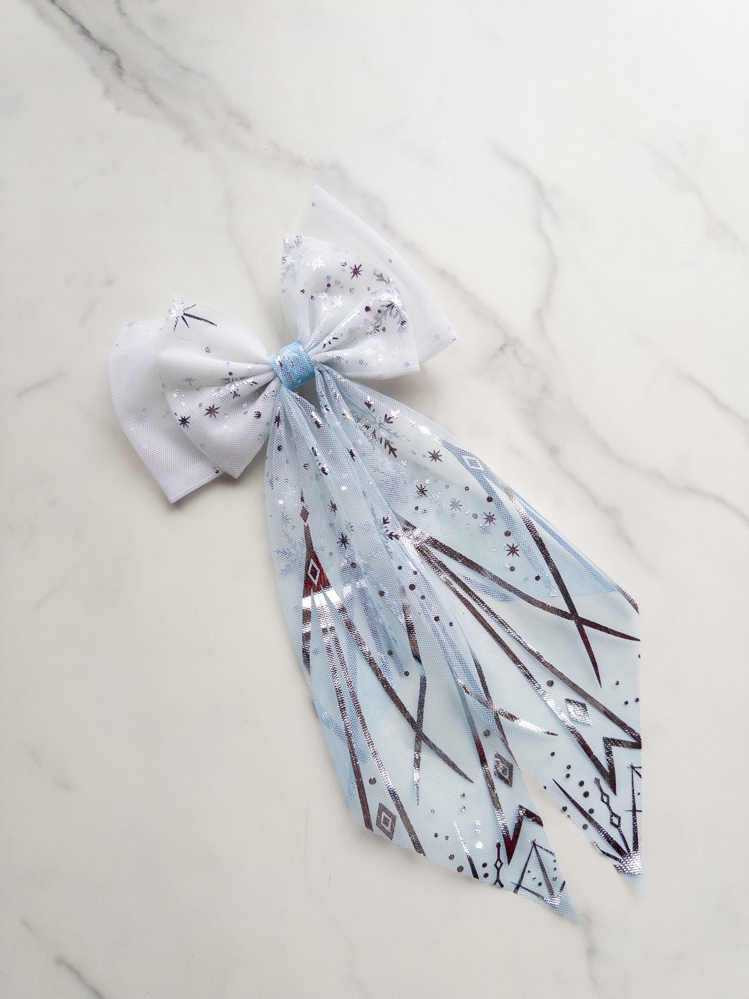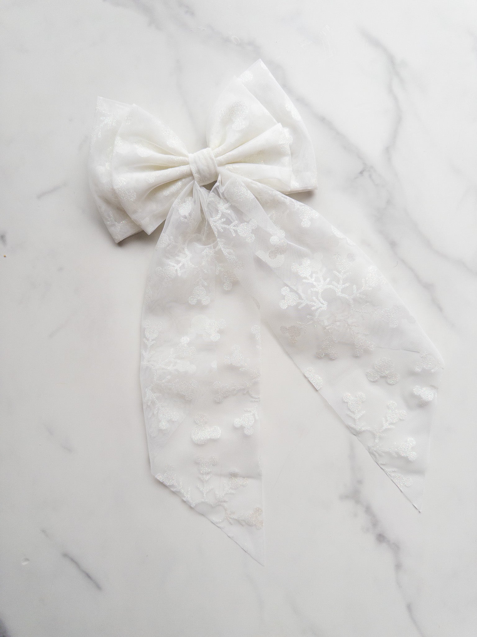 Tulle hair bow with a barrette. Bow is about 6.5 inches in width and 4 inches in height. Bow tails are about 11 inches in length from center of bow.