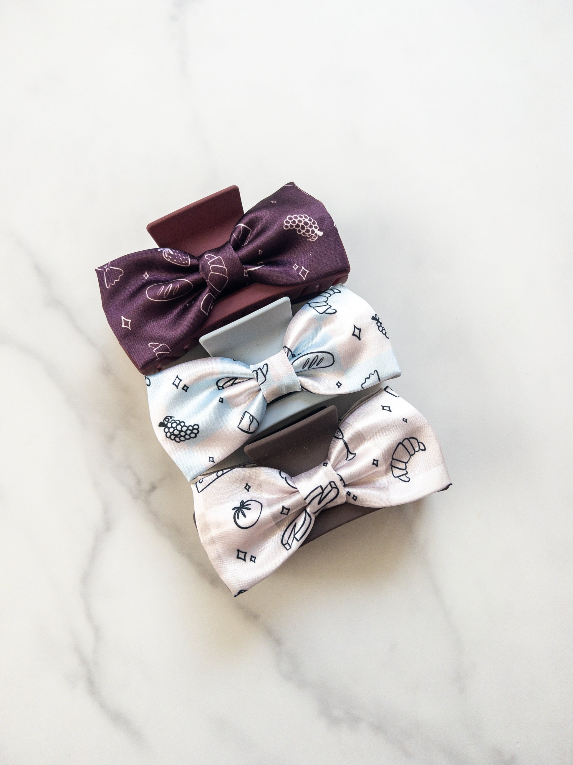 4 inch claw clip with satin bow. Bow is on both sides of claw clip.