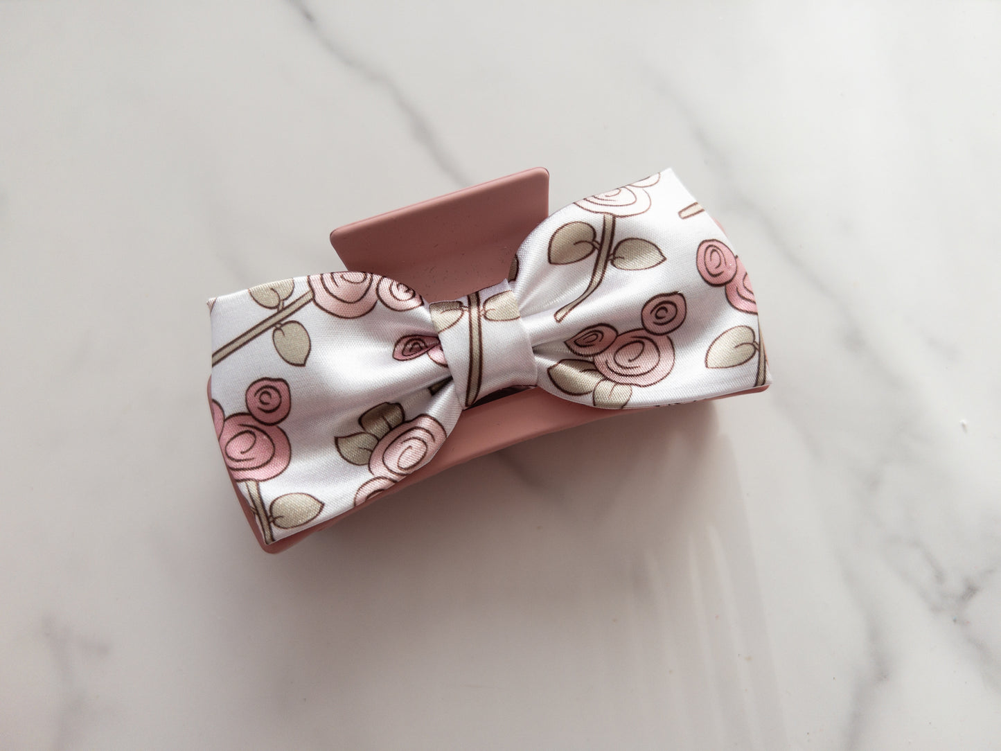 4 inch claw clip with satin bow. Bow is on both sides of claw clip.