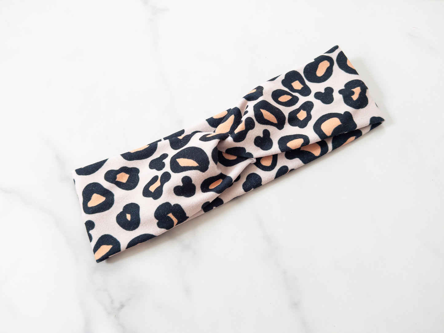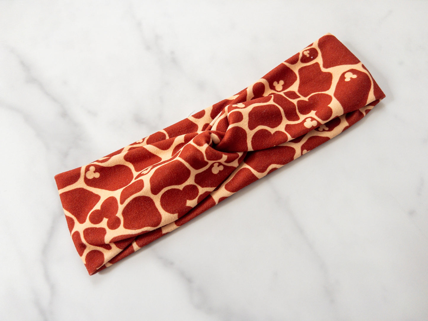 Stretch headband with twist. Headbands are about 18 inches in circumference and have a stretch to them. Headbands are 2.5 inches in width. Made from double brushed polyester material. Character placement will vary on individual headbands.