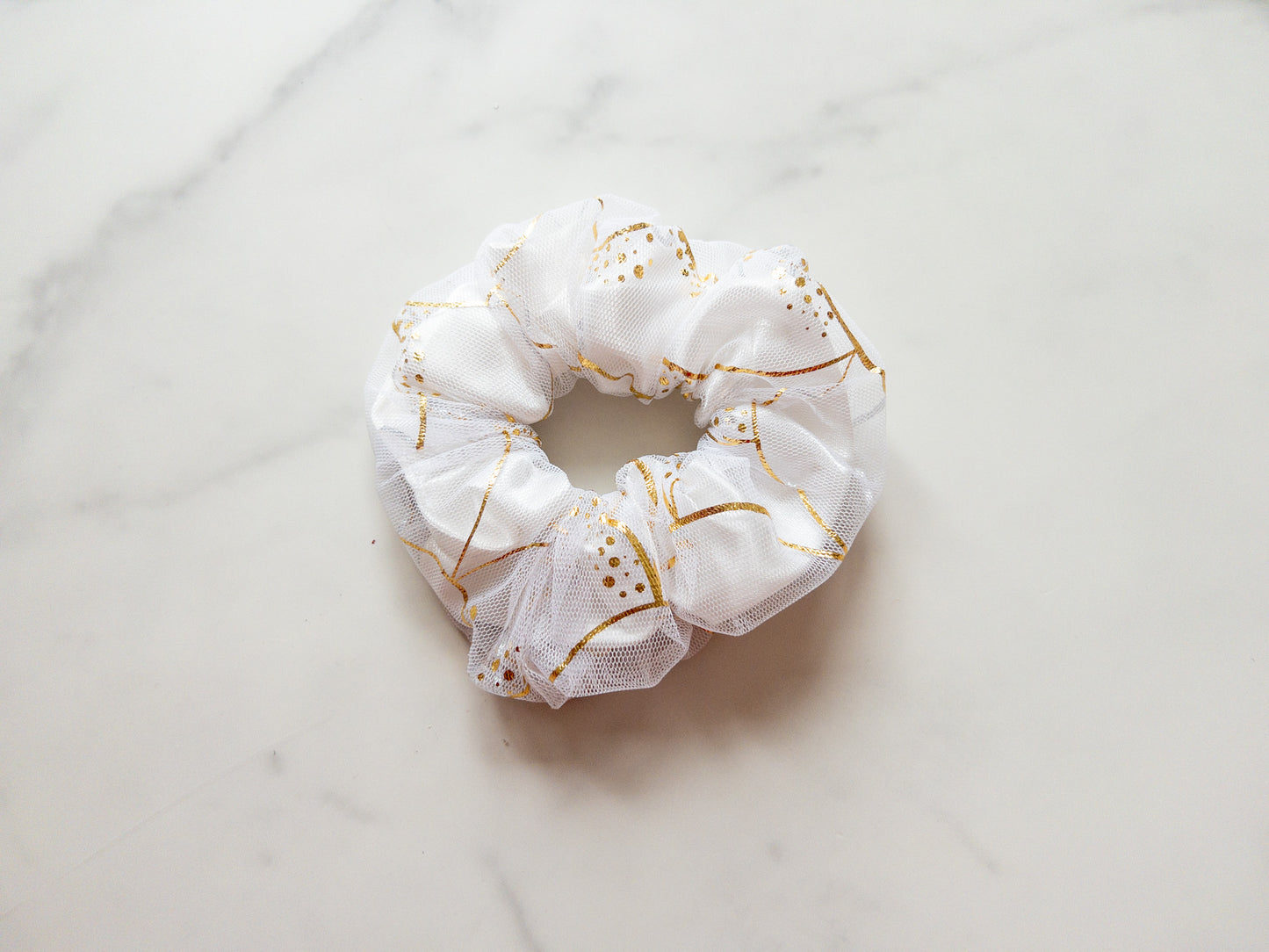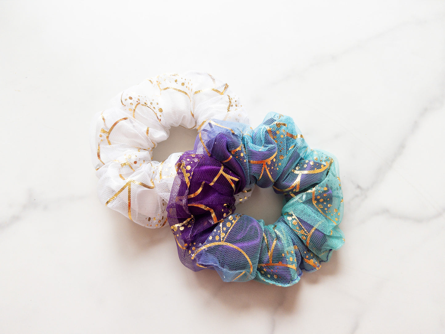One (1) large double layer tulle scrunchie. Outer layer is tulle and inner layer is satin. Satin layer is about the size of standard scrunchie. Placement of characters may vary on individual scrunchies.