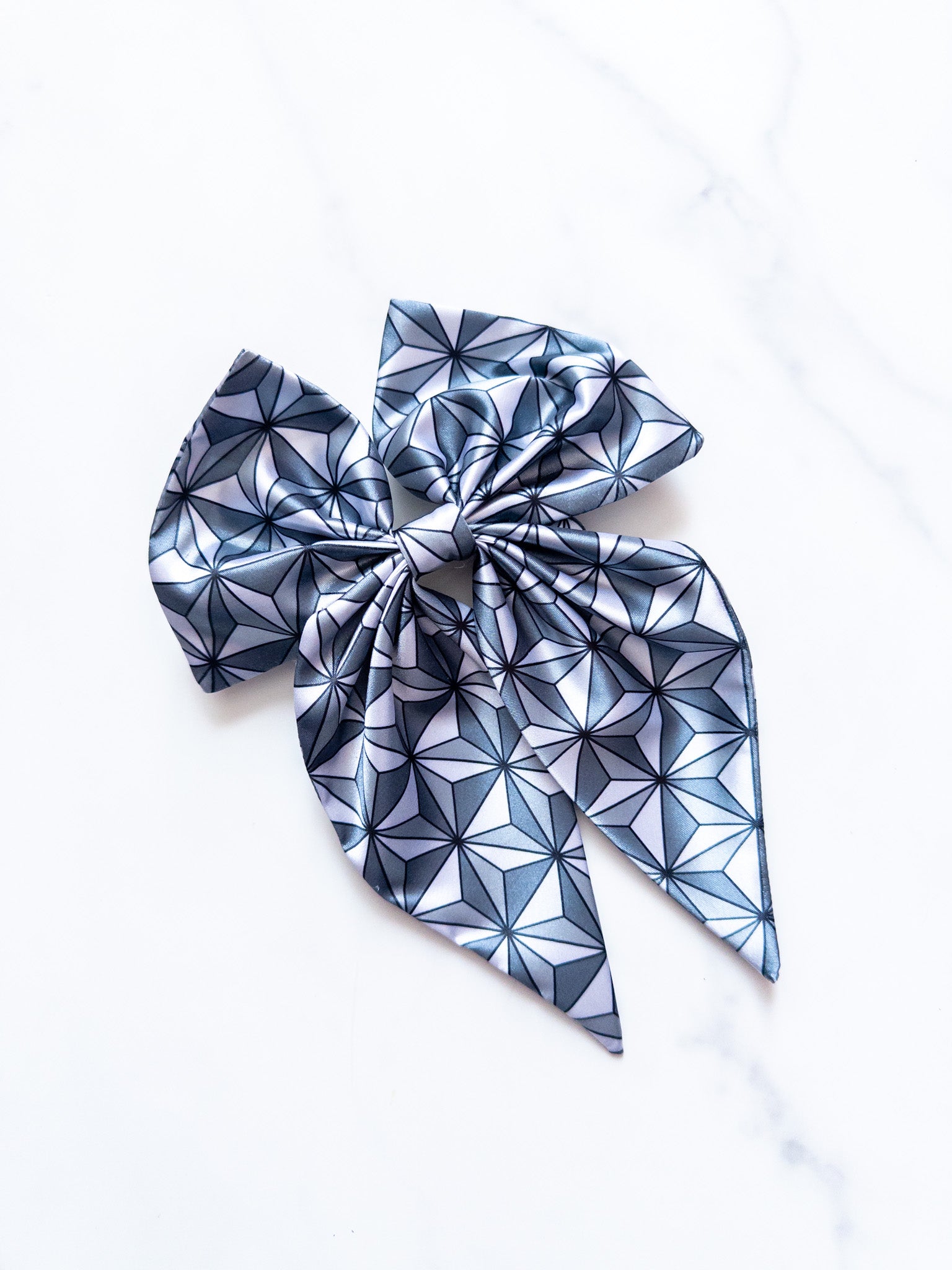 Large satin bow with 3 inch barrette on back. Bow is 6 inches wide and 9 inches long.