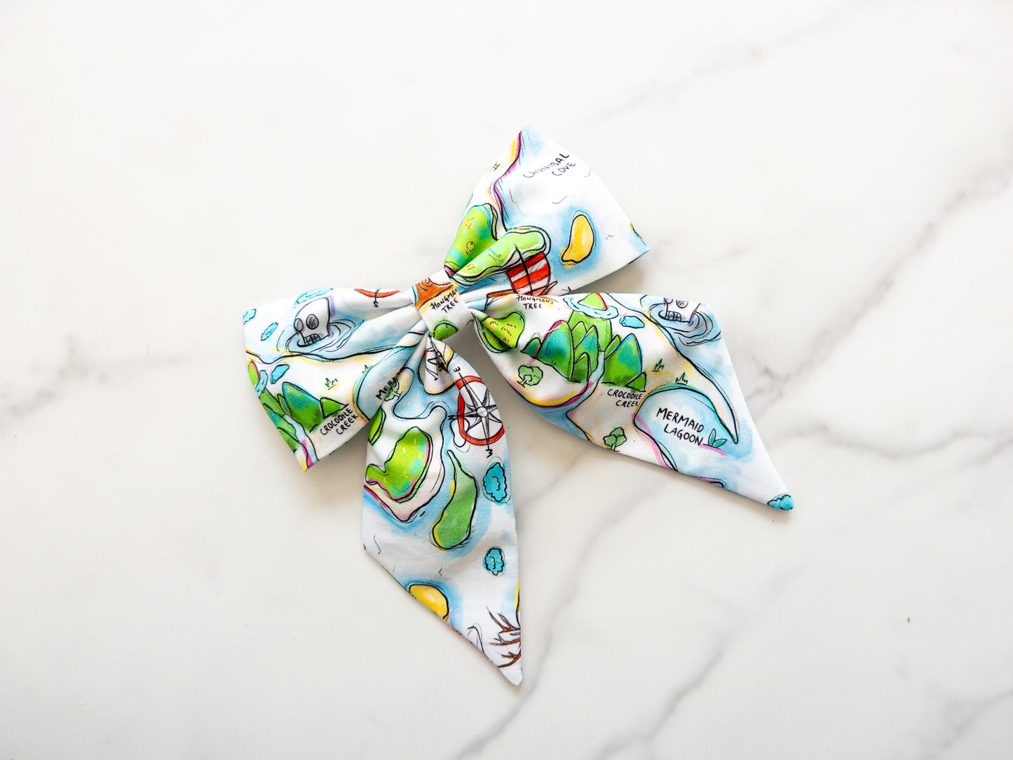 Bow is about 5.5 inches wide with tails. Back has a 3 inch barrette.