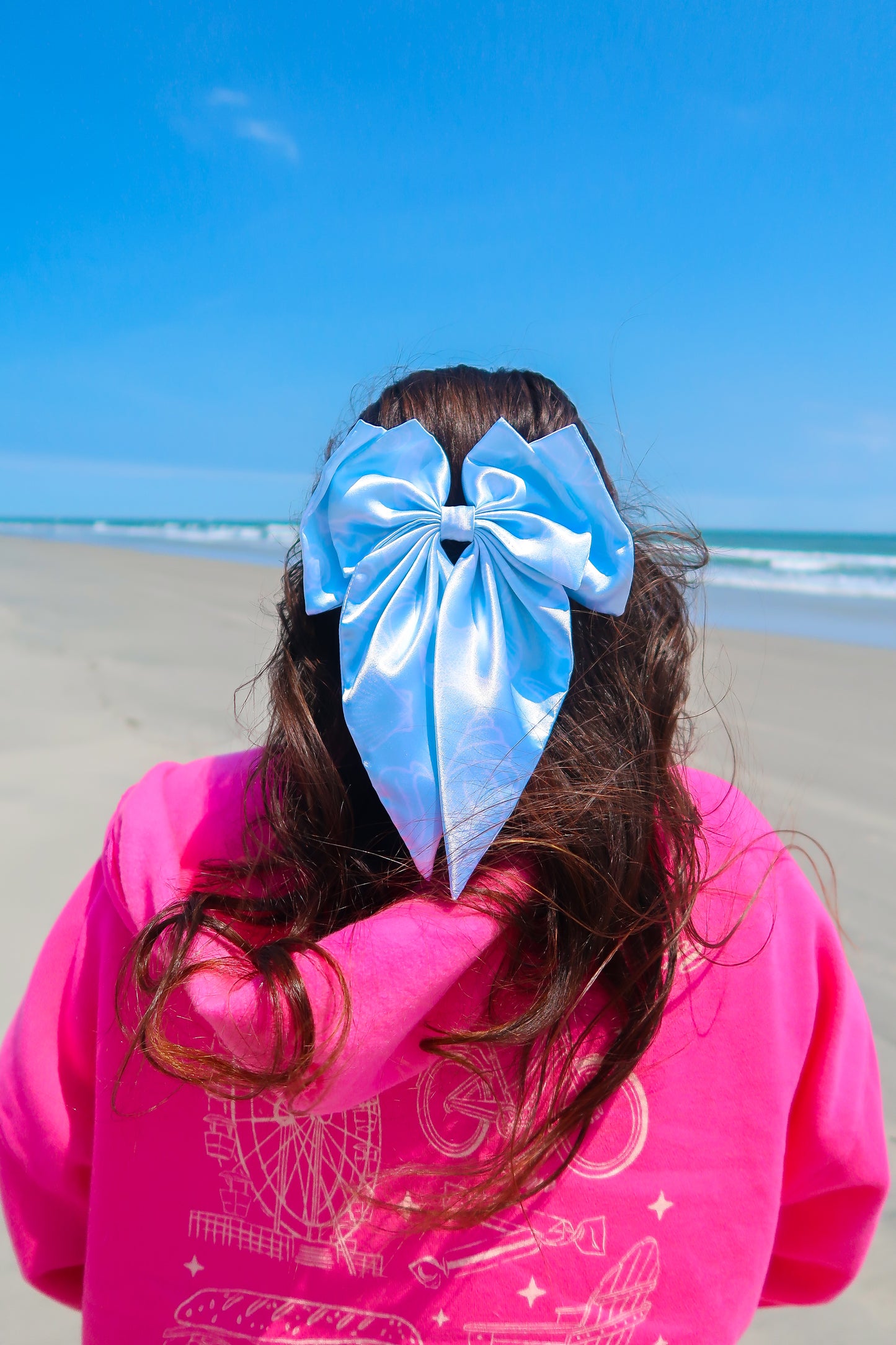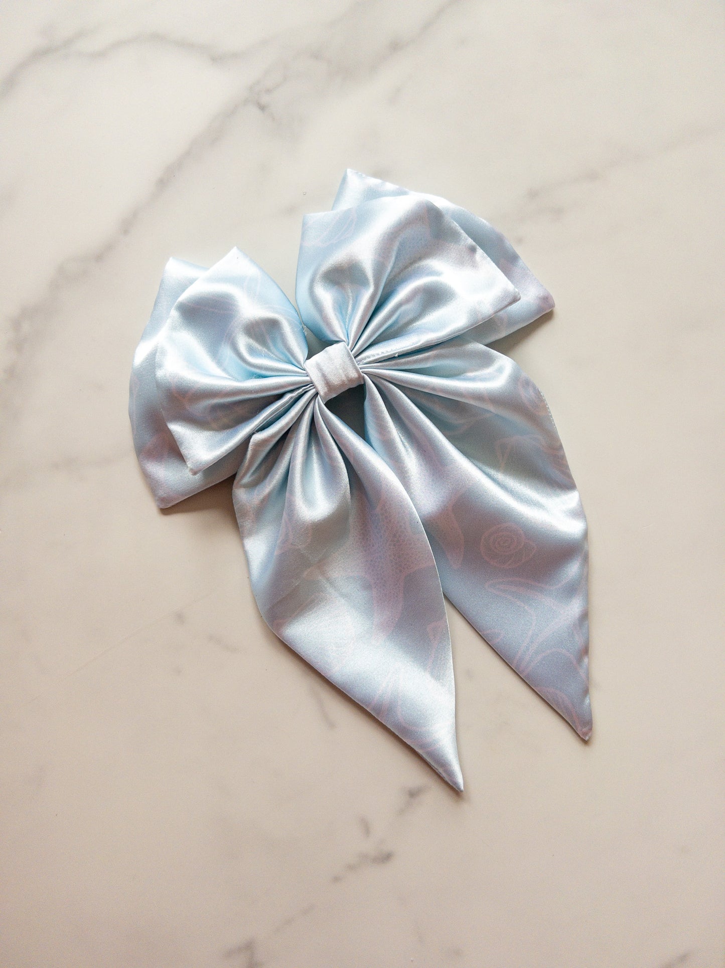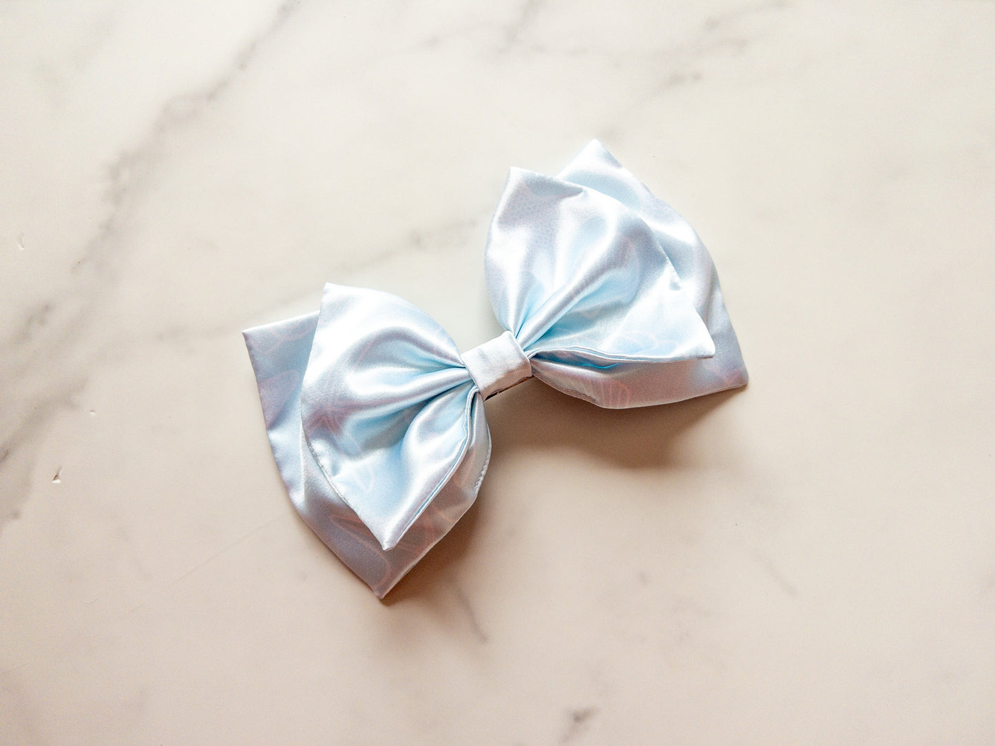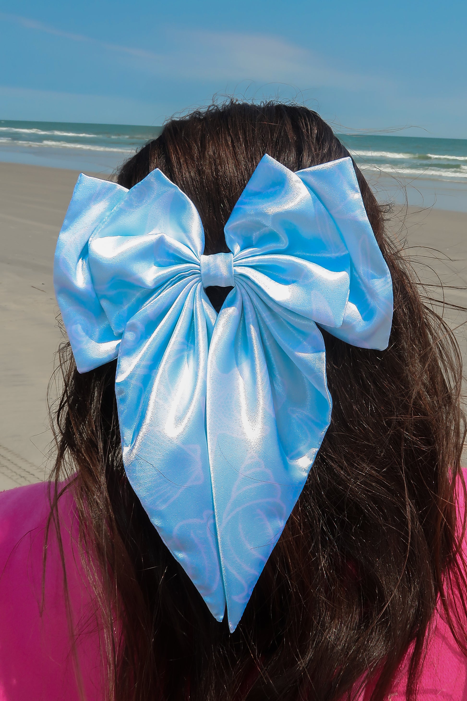 Large satin bow with 3 inch barrette on back. Bow is 8 inches wide and 10 inches long.