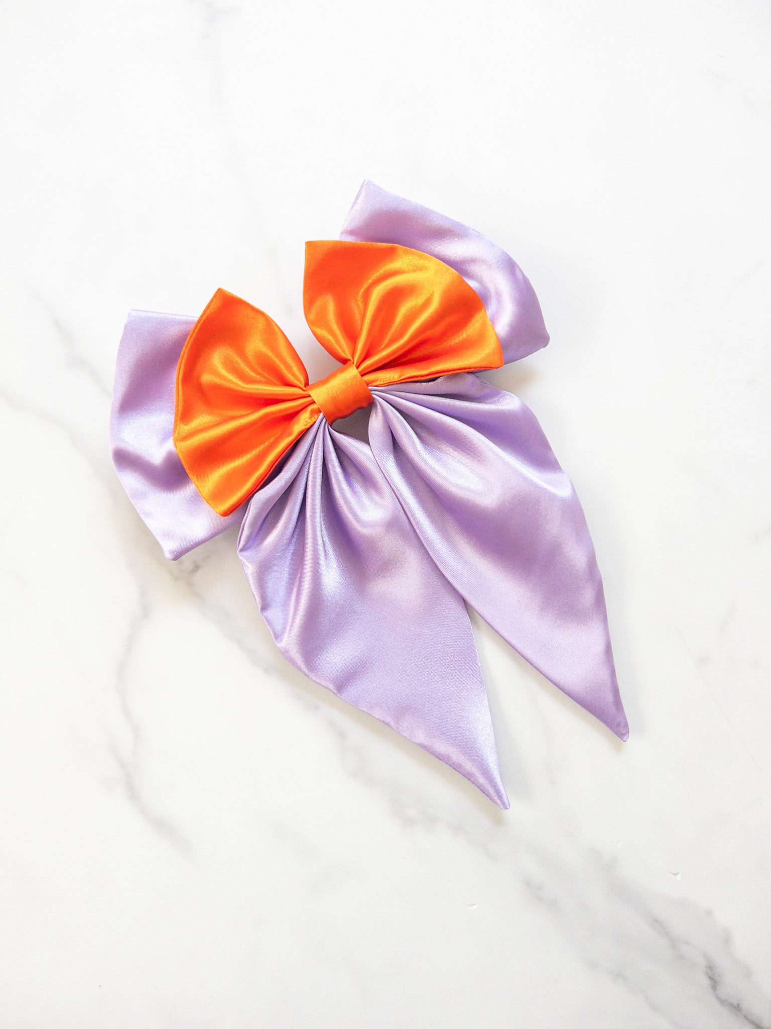 Large satin bow with 3 inch barrette on back. Bow with tails is 8 inches wide and 10 inches long.