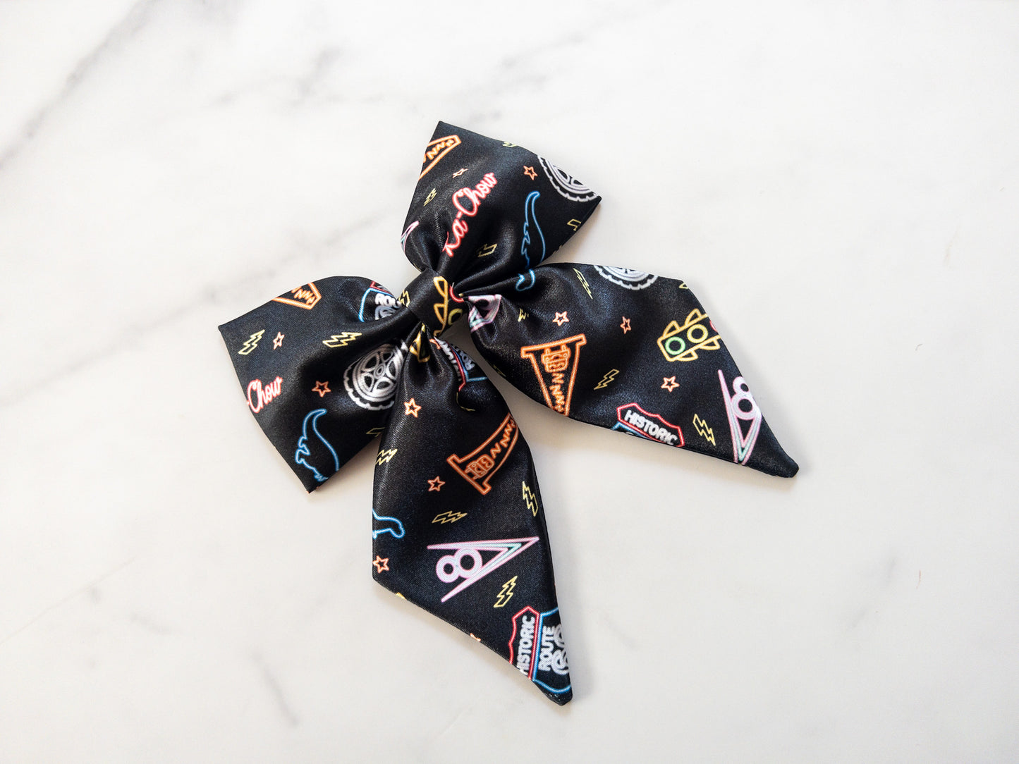 Bow is about 5.5 inches wide with tails. Back has a 3 inch barrette.
