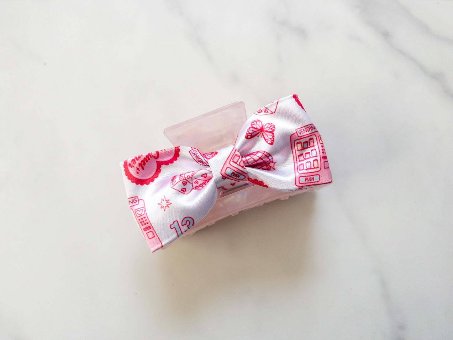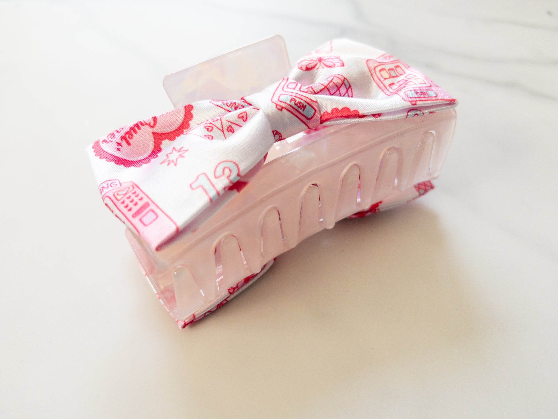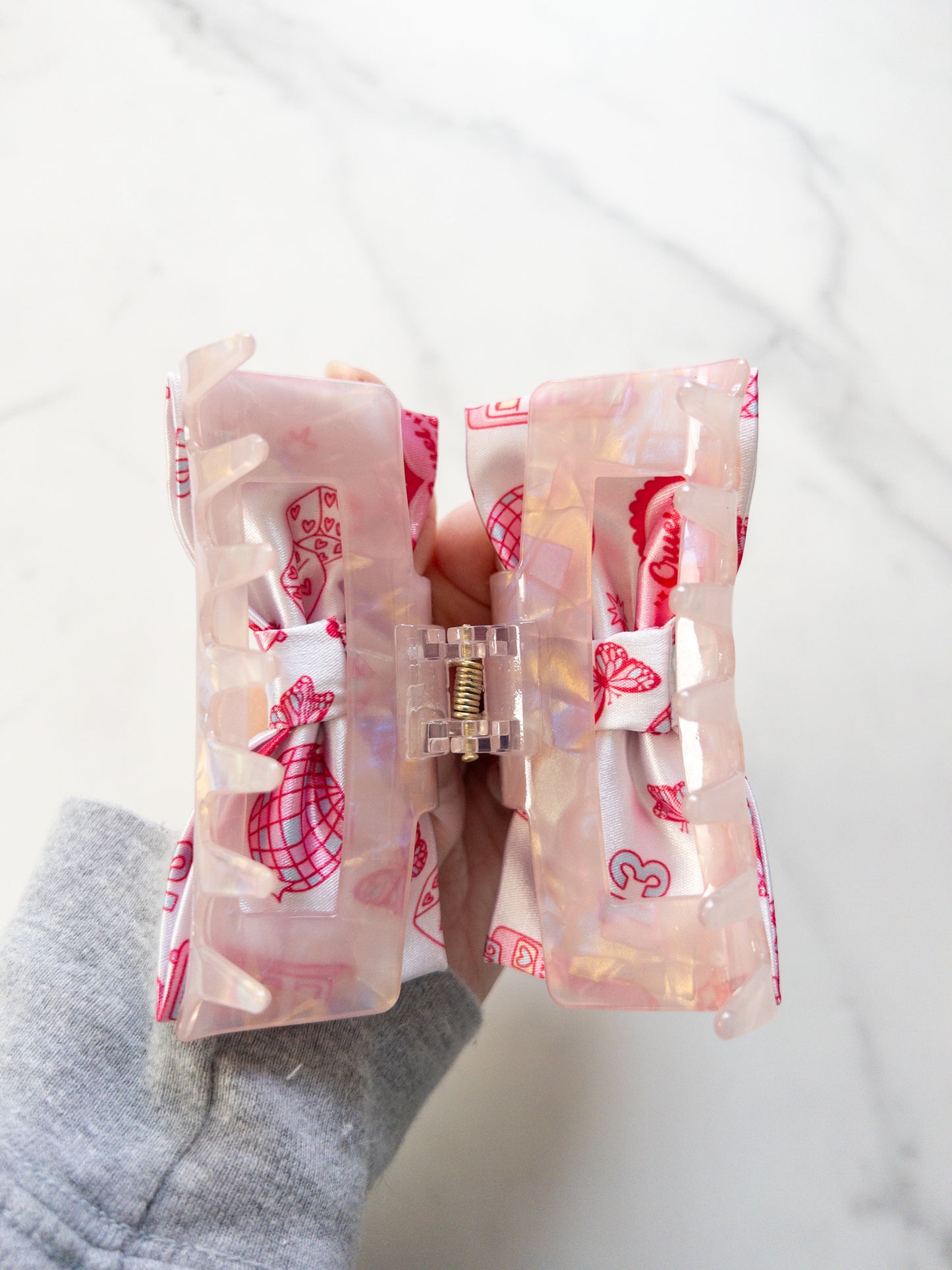 4 inch claw clip with satin bow. Bow is on both sides of claw clip.