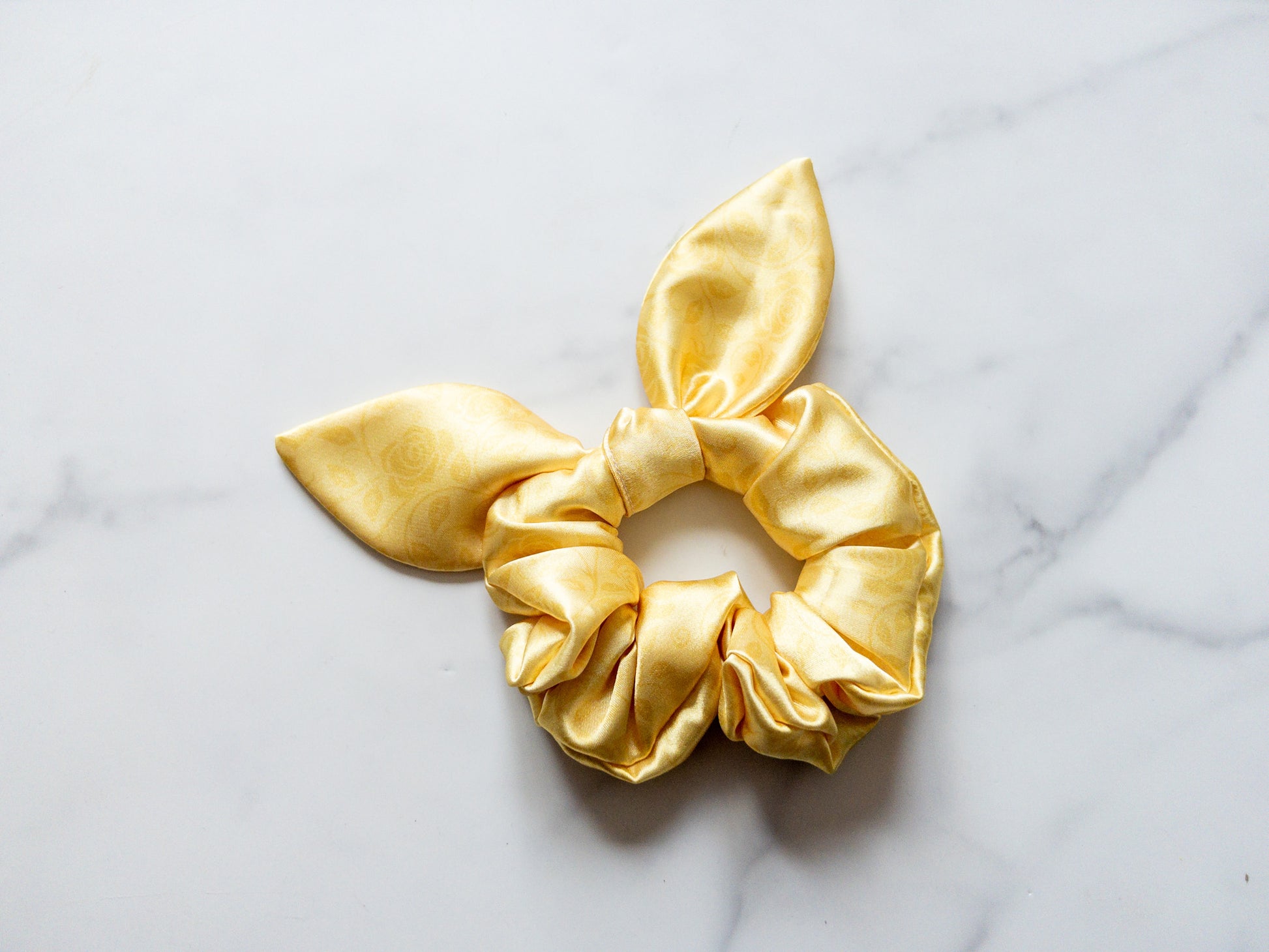 One (1) satin scrunchie with bow. Characters will vary on each individual scrunchie.
