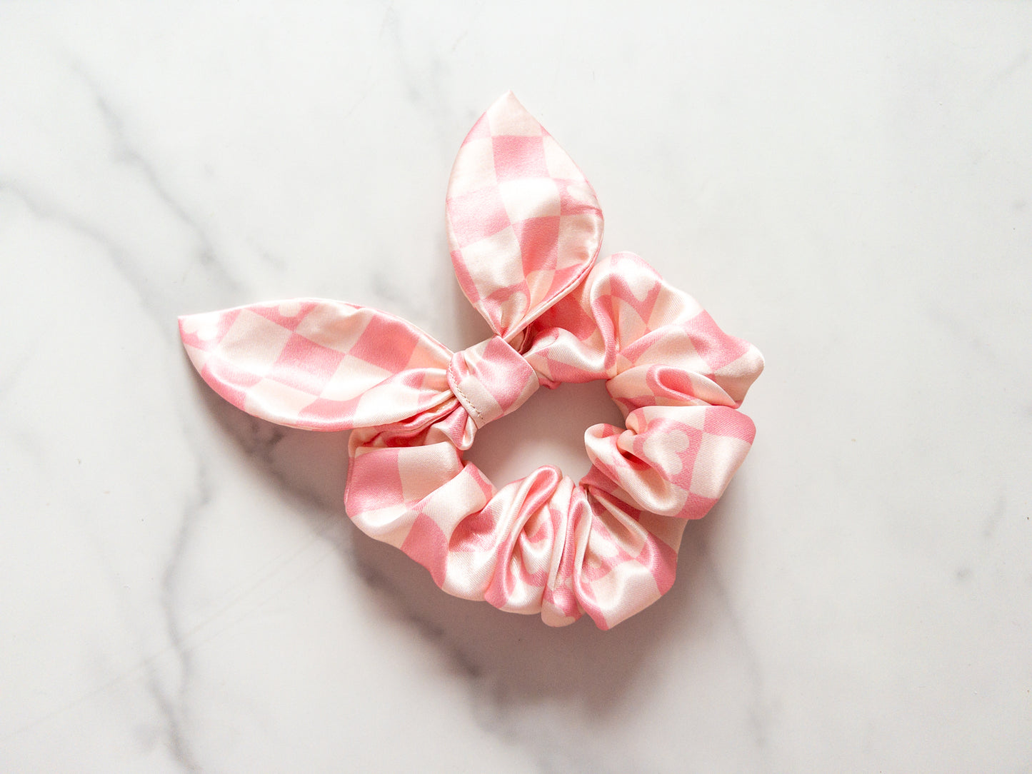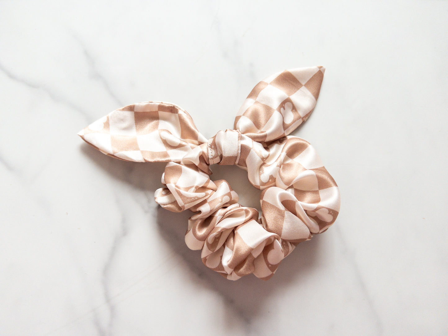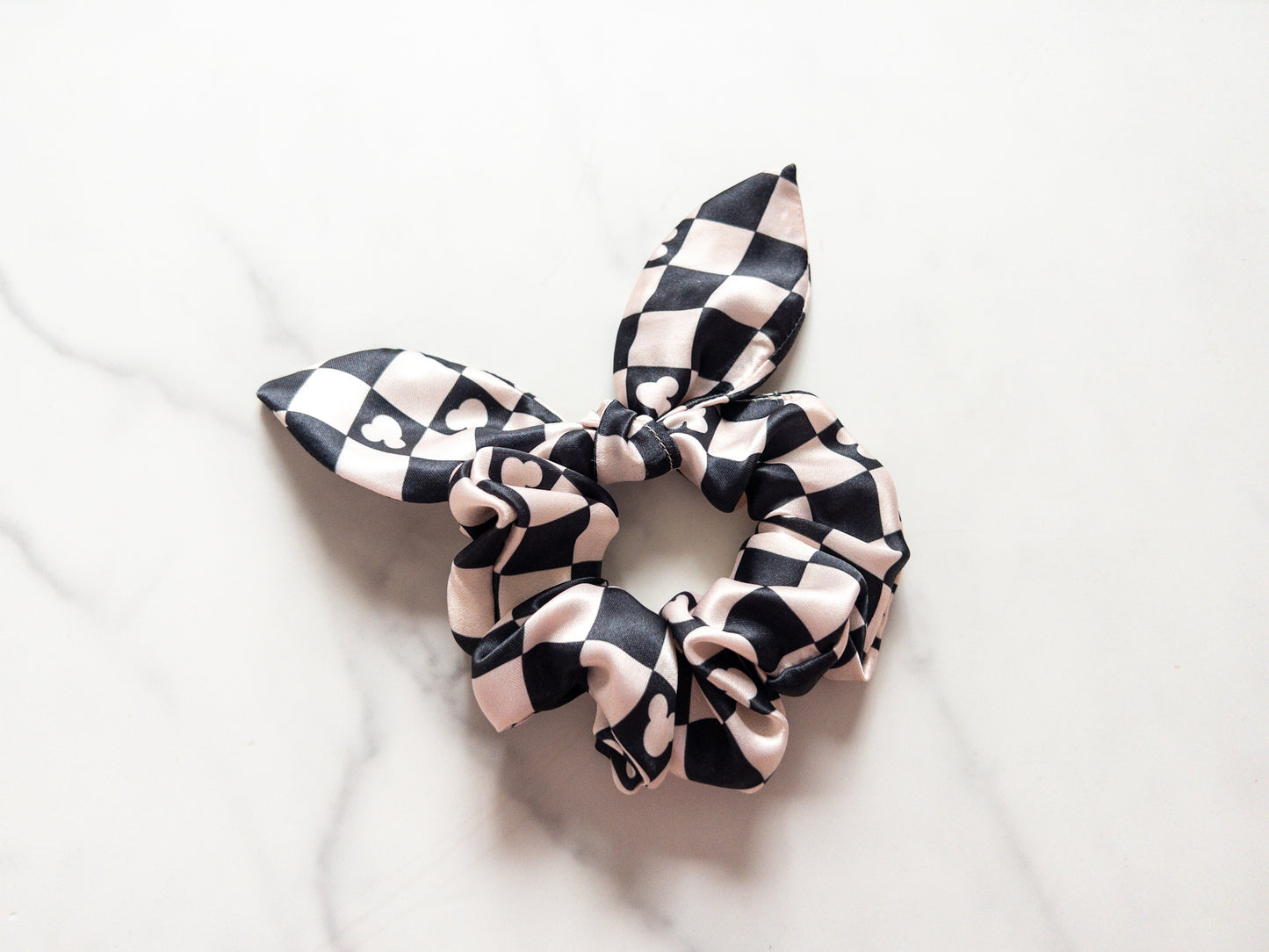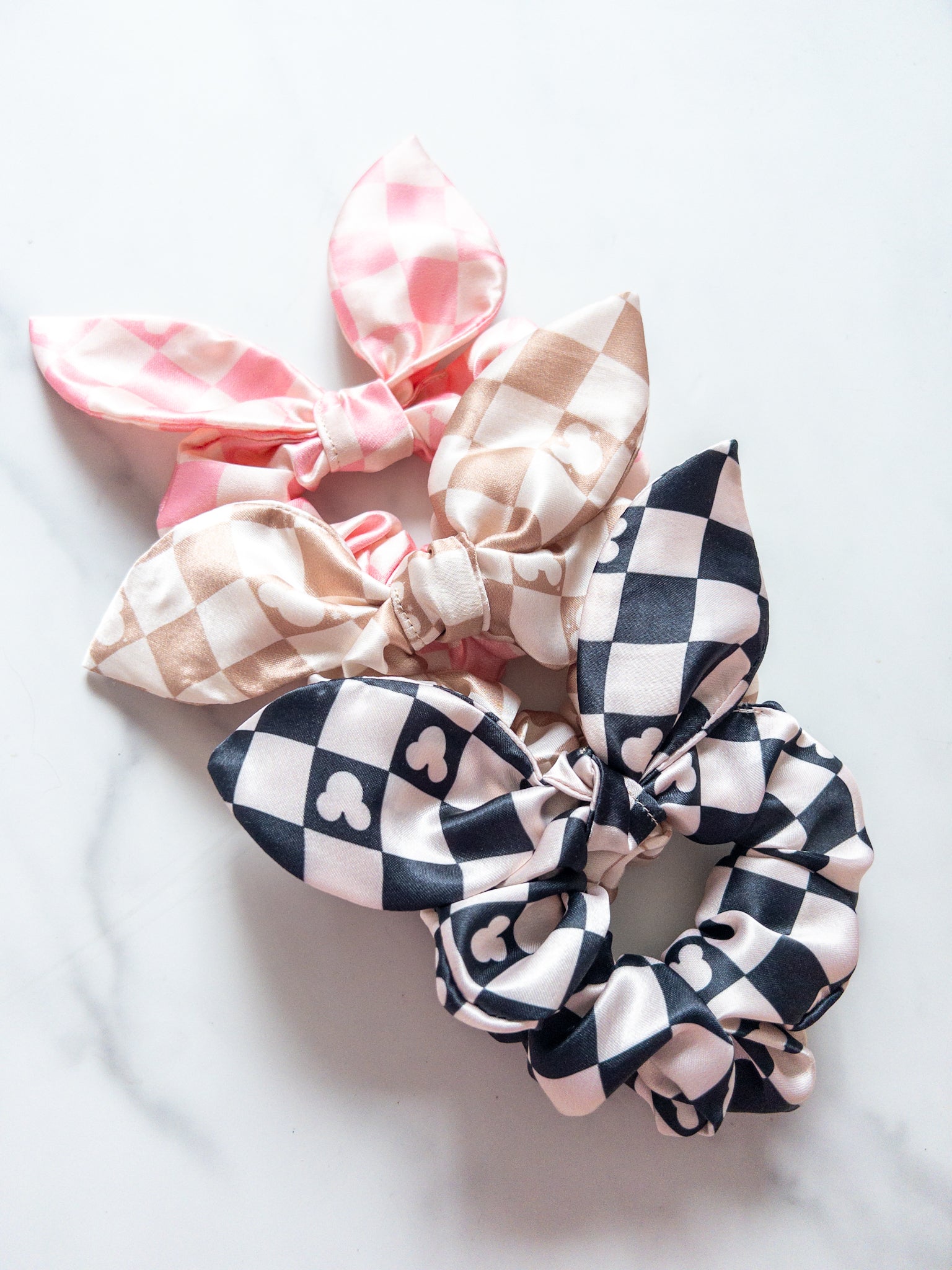 One (1) satin scrunchie with bow. Characters will vary on each individual scrunchie.