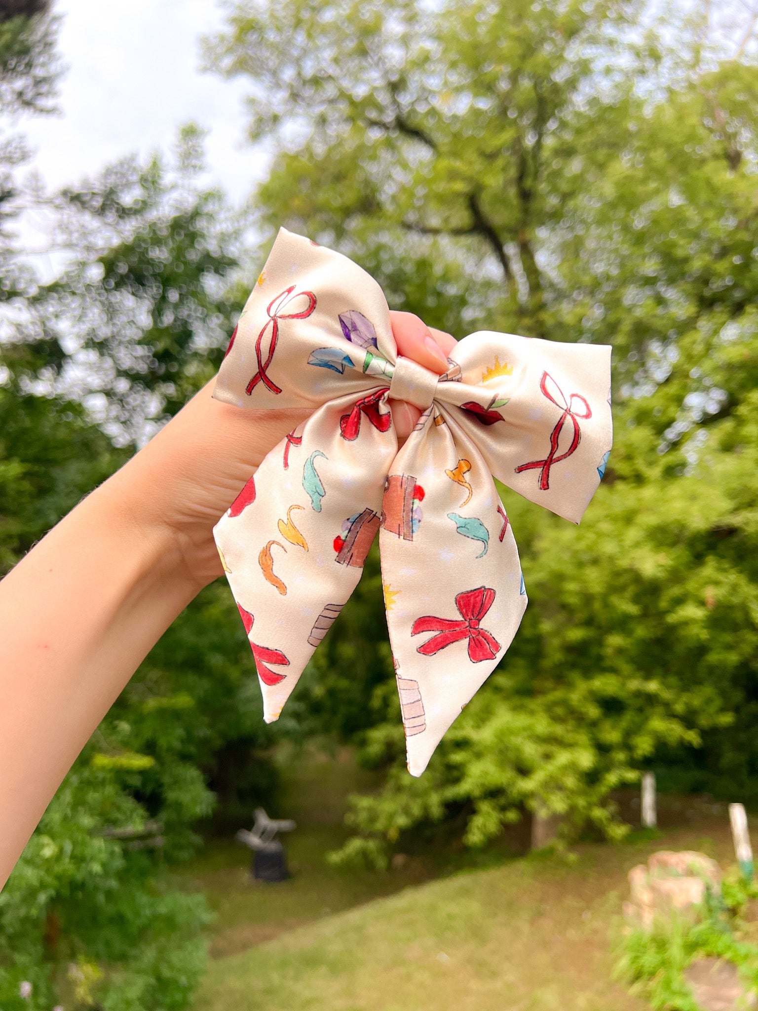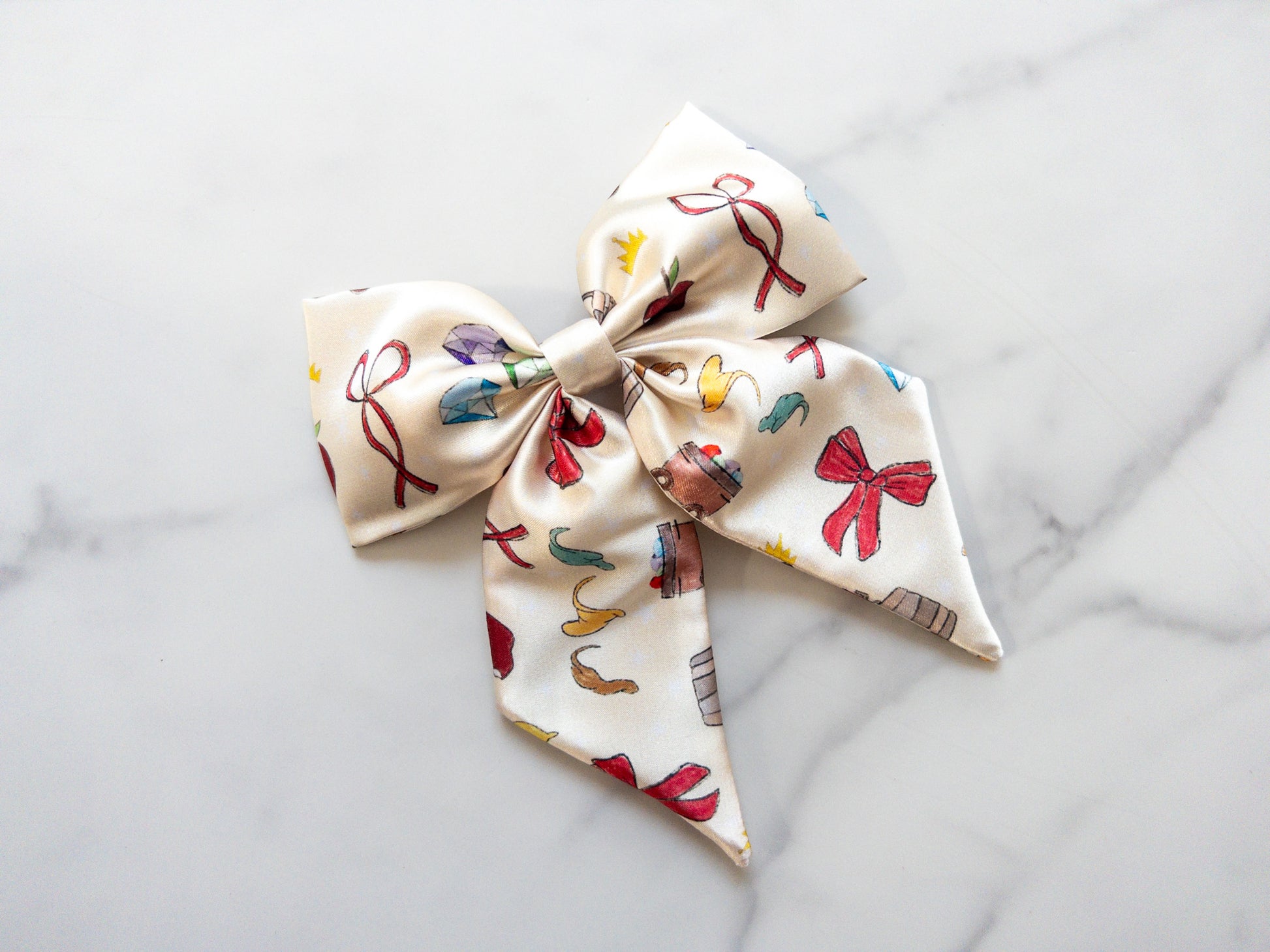 Bow is about 5.5 inches wide with tails. Back has a 3 inch barrette.