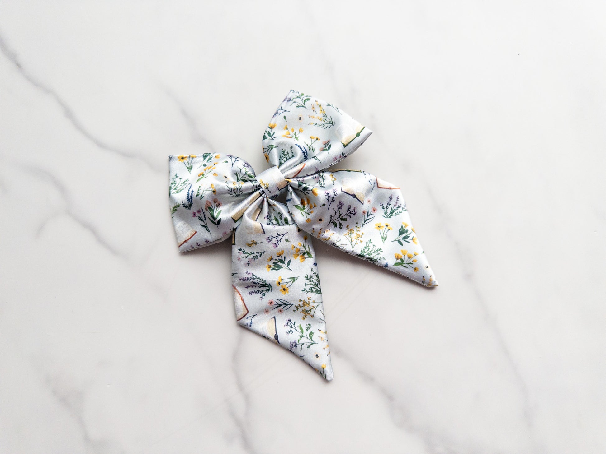 Bow is about 5.5 inches wide with tails. Back has a 3 inch barrette.