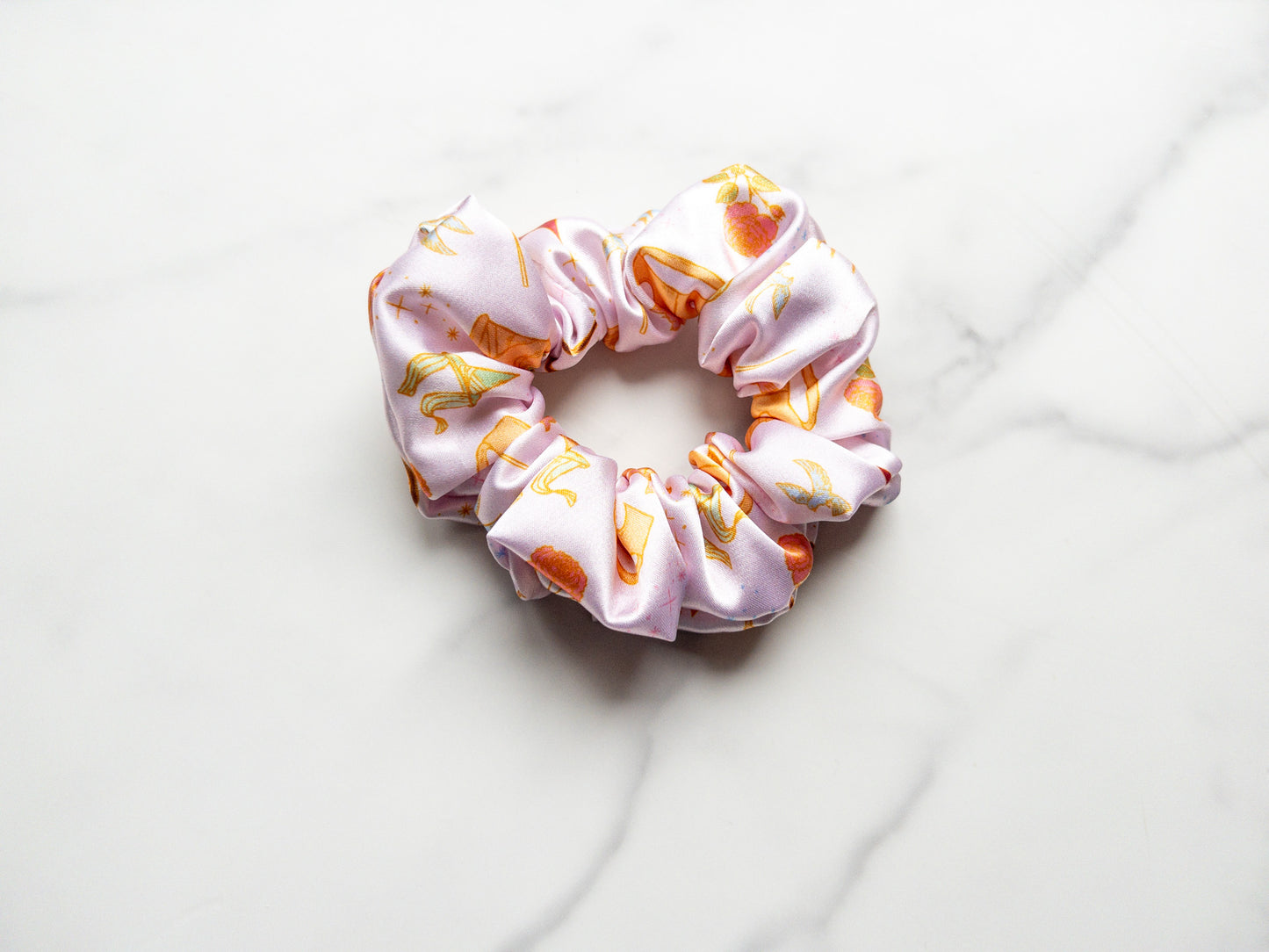 One (1) satin regular scrunchie. Placement of characters may vary on individual scrunchies.
