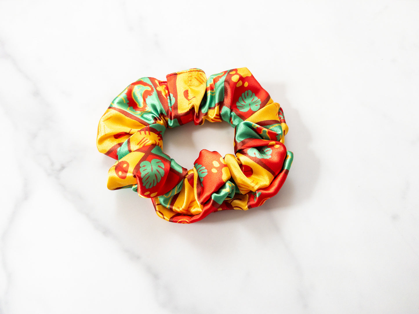 One (1) satin regular scrunchie. Placement of characters may vary on individual scrunchies.