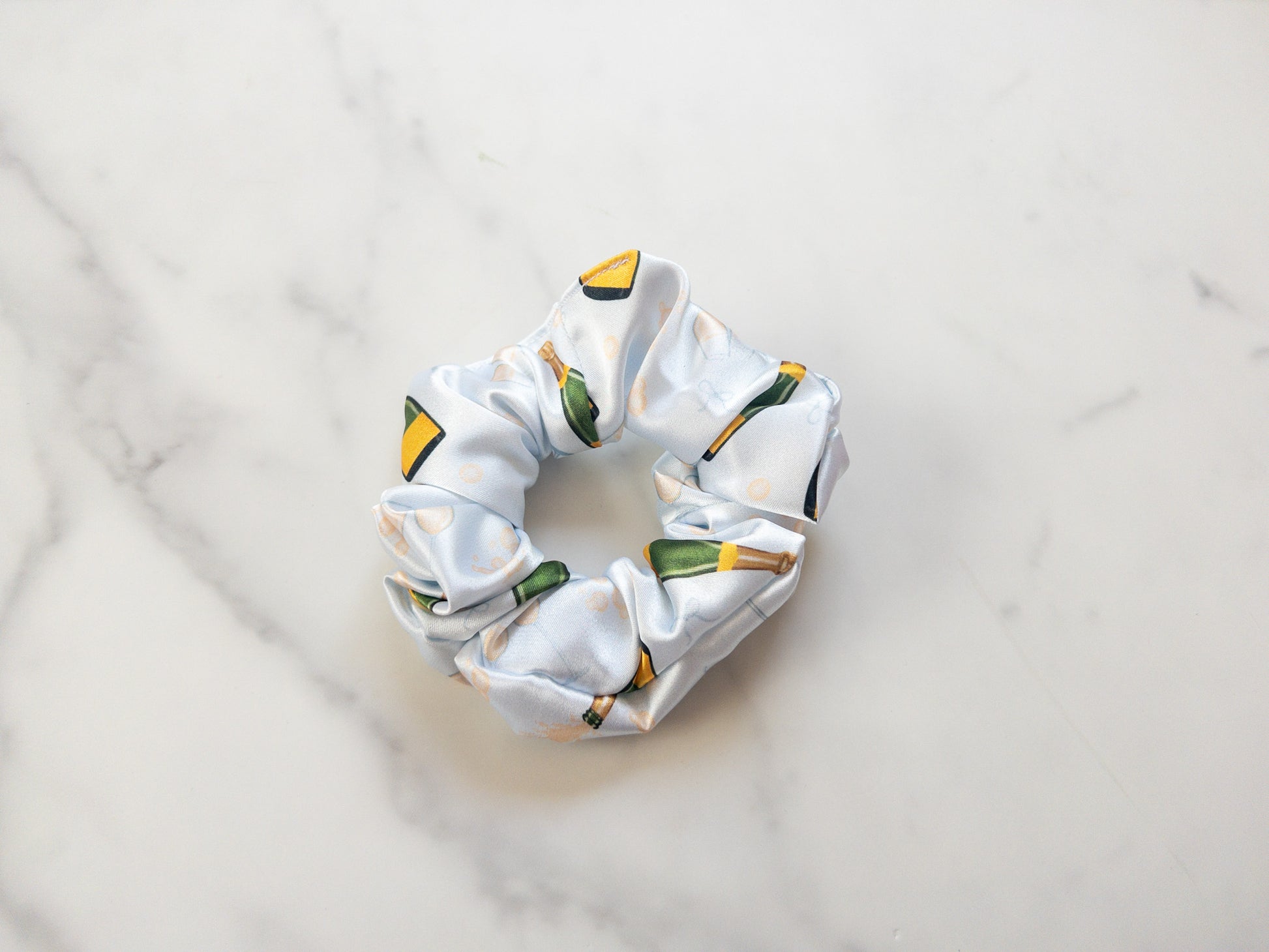 One (1) satin regular scrunchie. Placement of characters may vary on individual scrunchies.