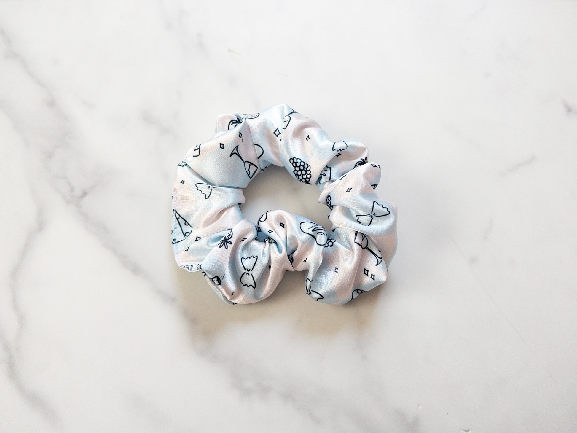 One (1) satin regular scrunchie. Placement of characters may vary on individual scrunchies.