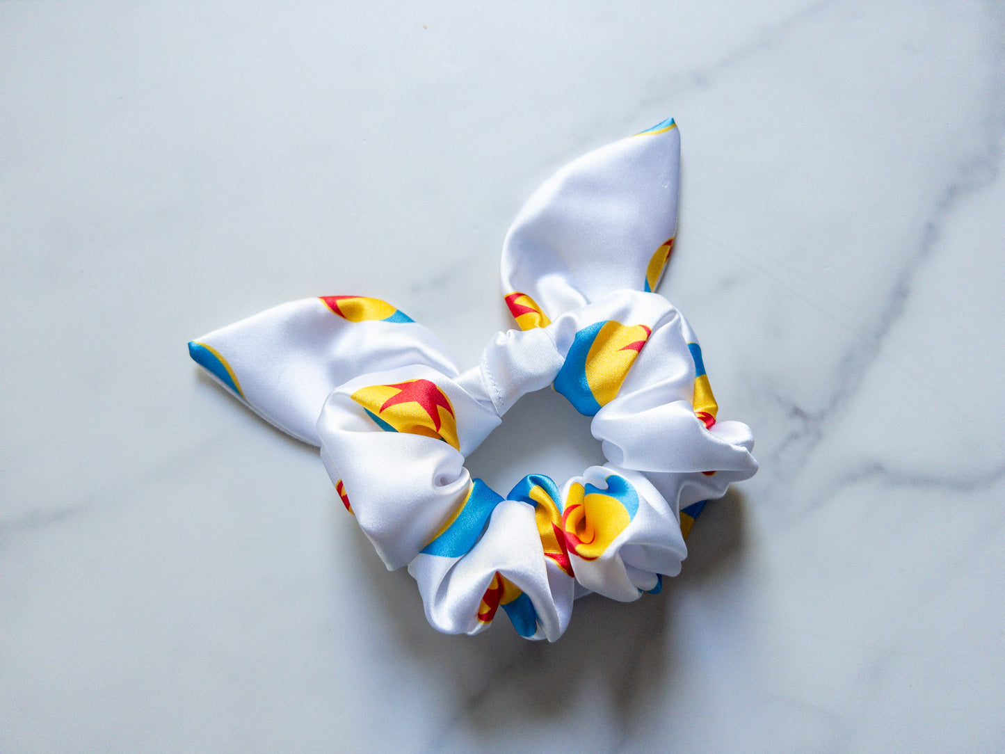 One (1) satin scrunchie with bow. Characters will vary on each individual scrunchie.