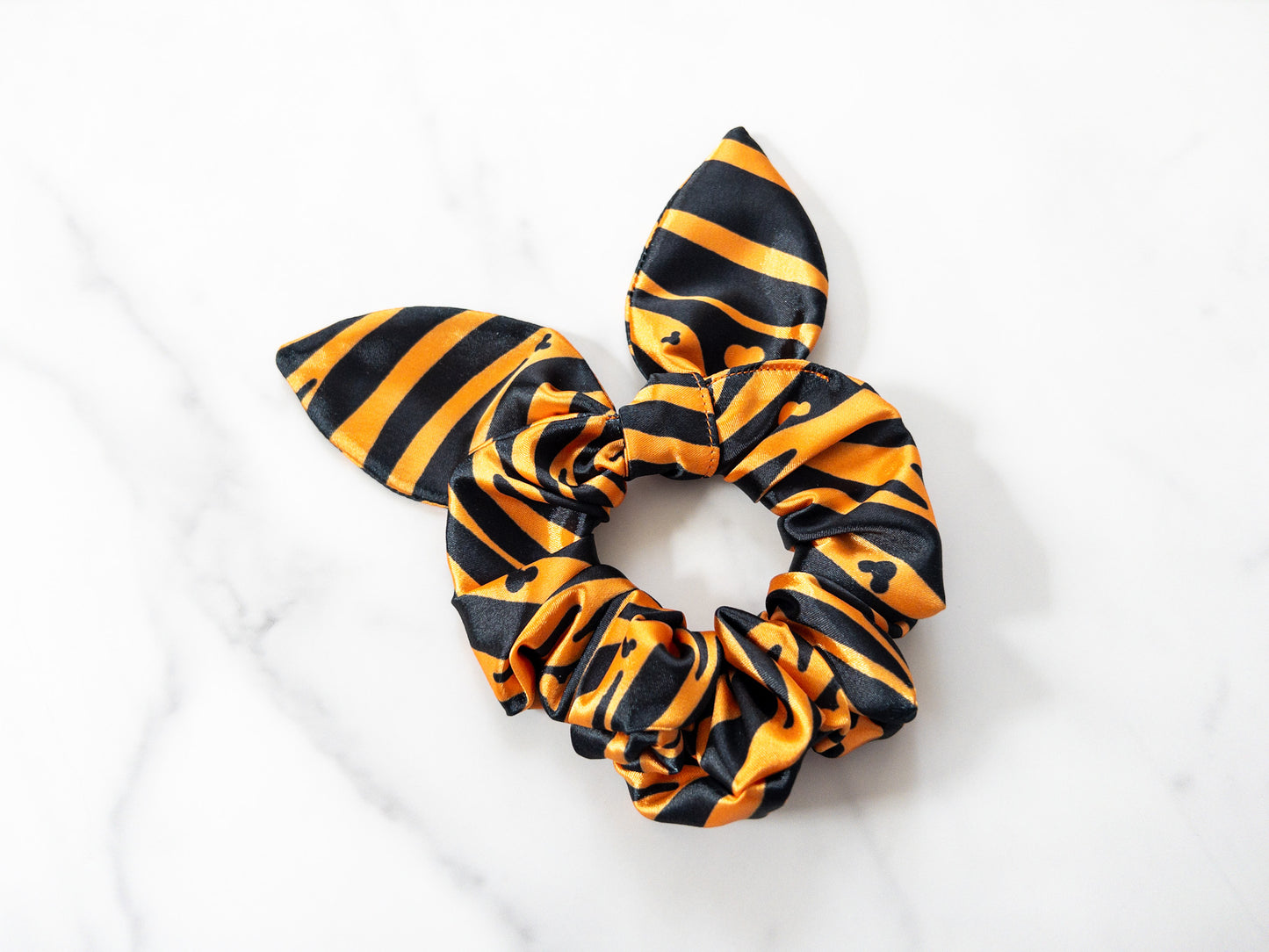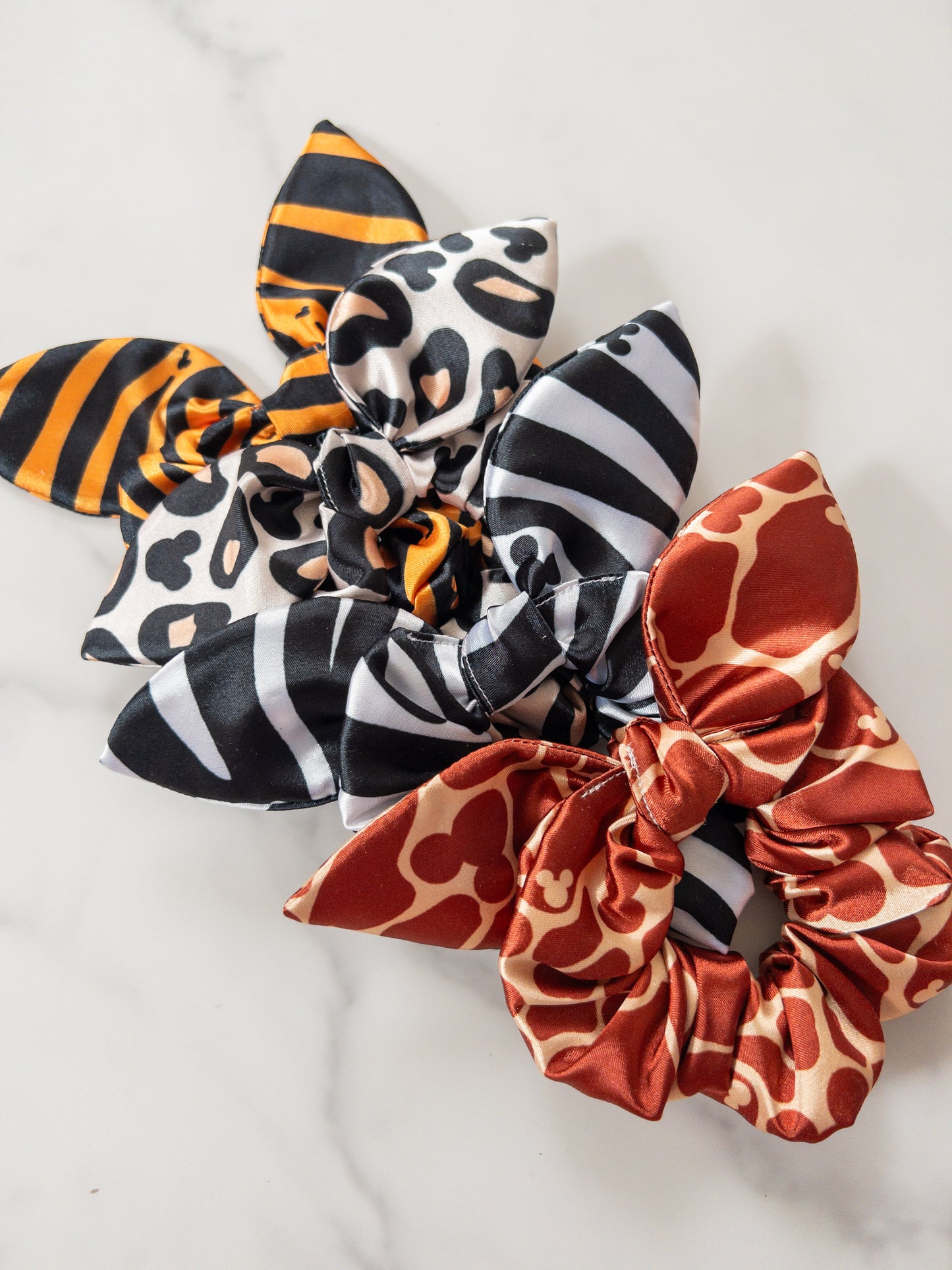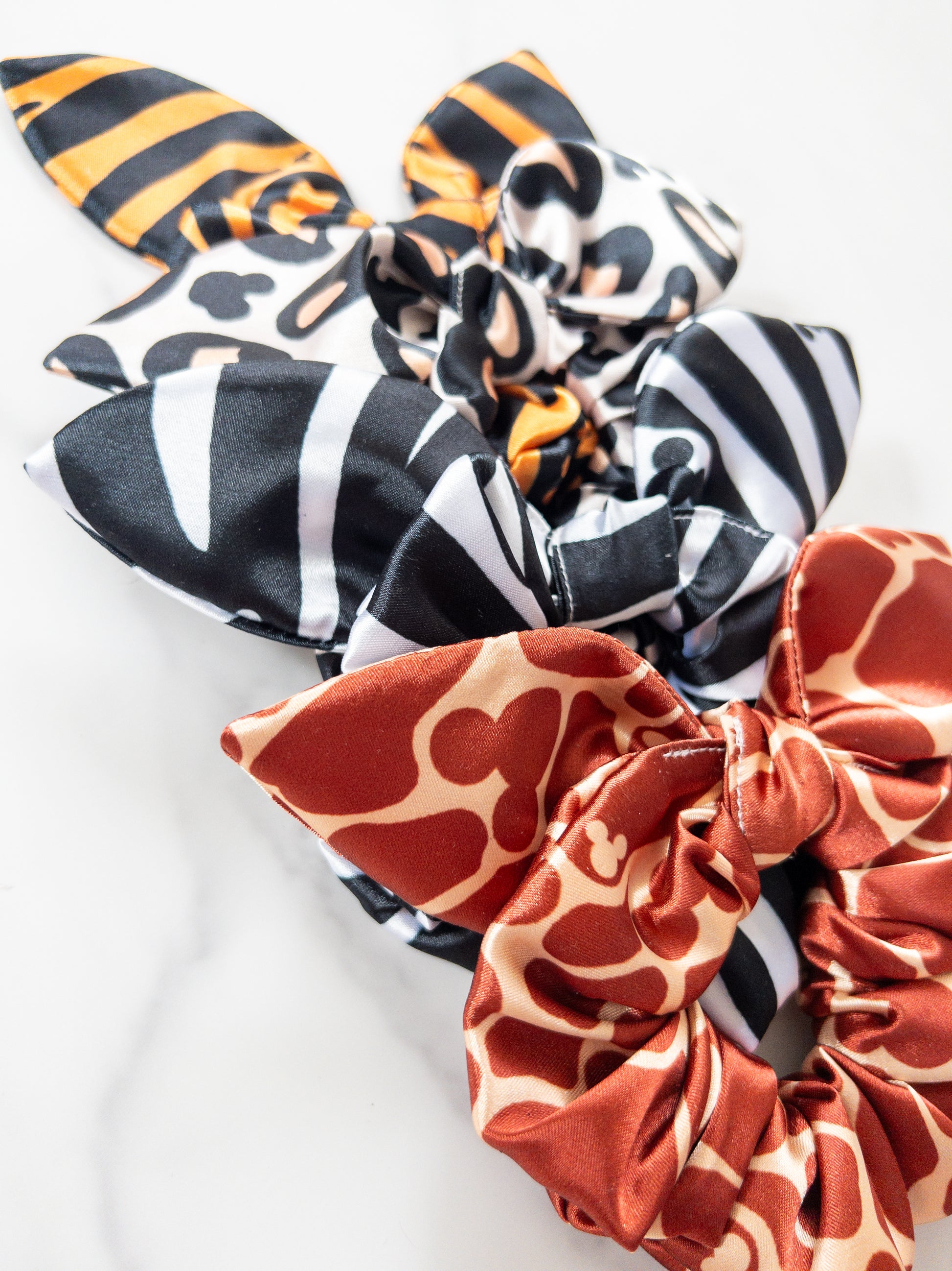 One (1) satin scrunchie with bow. Characters will vary on each individual scrunchie.