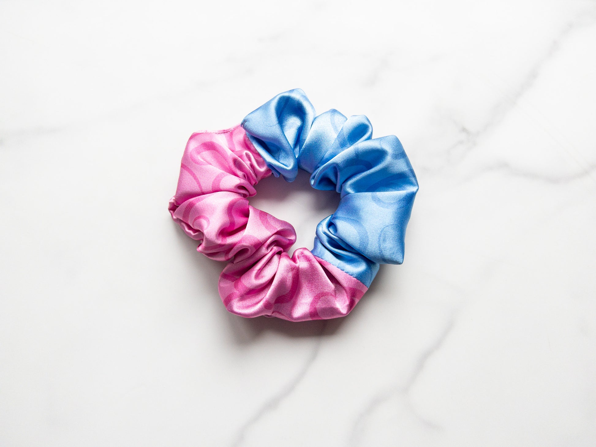 One (1) satin regular scrunchie. Placement of characters may vary on individual scrunchies.