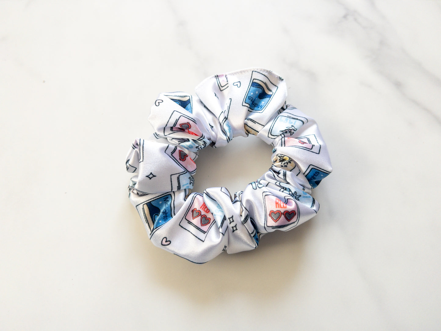 One (1) regular satin scrunchie. Placement of characters may vary on individual scrunchies.