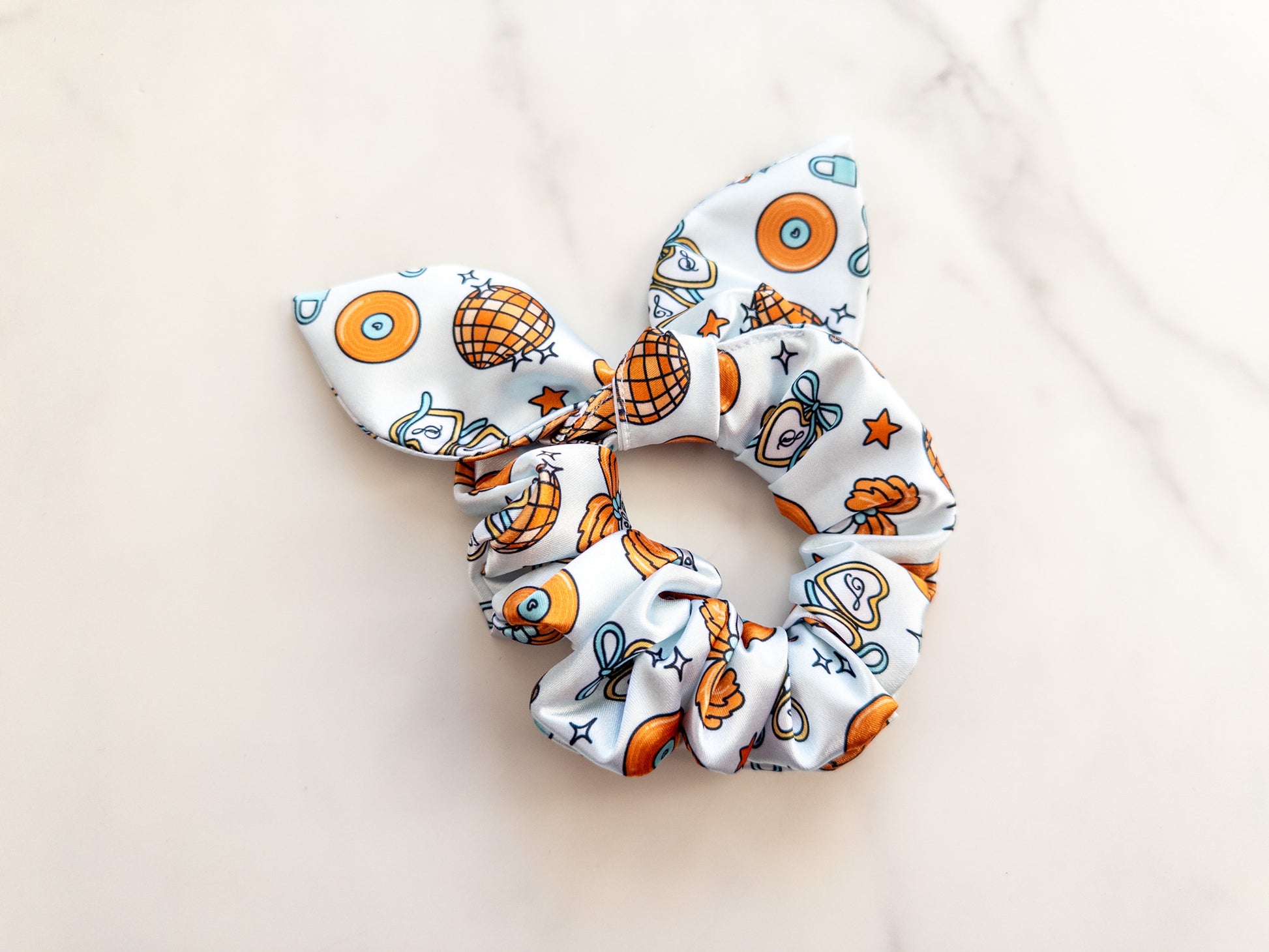 One (1) satin scrunchie with bow. Characters will vary on each individual scrunchie.