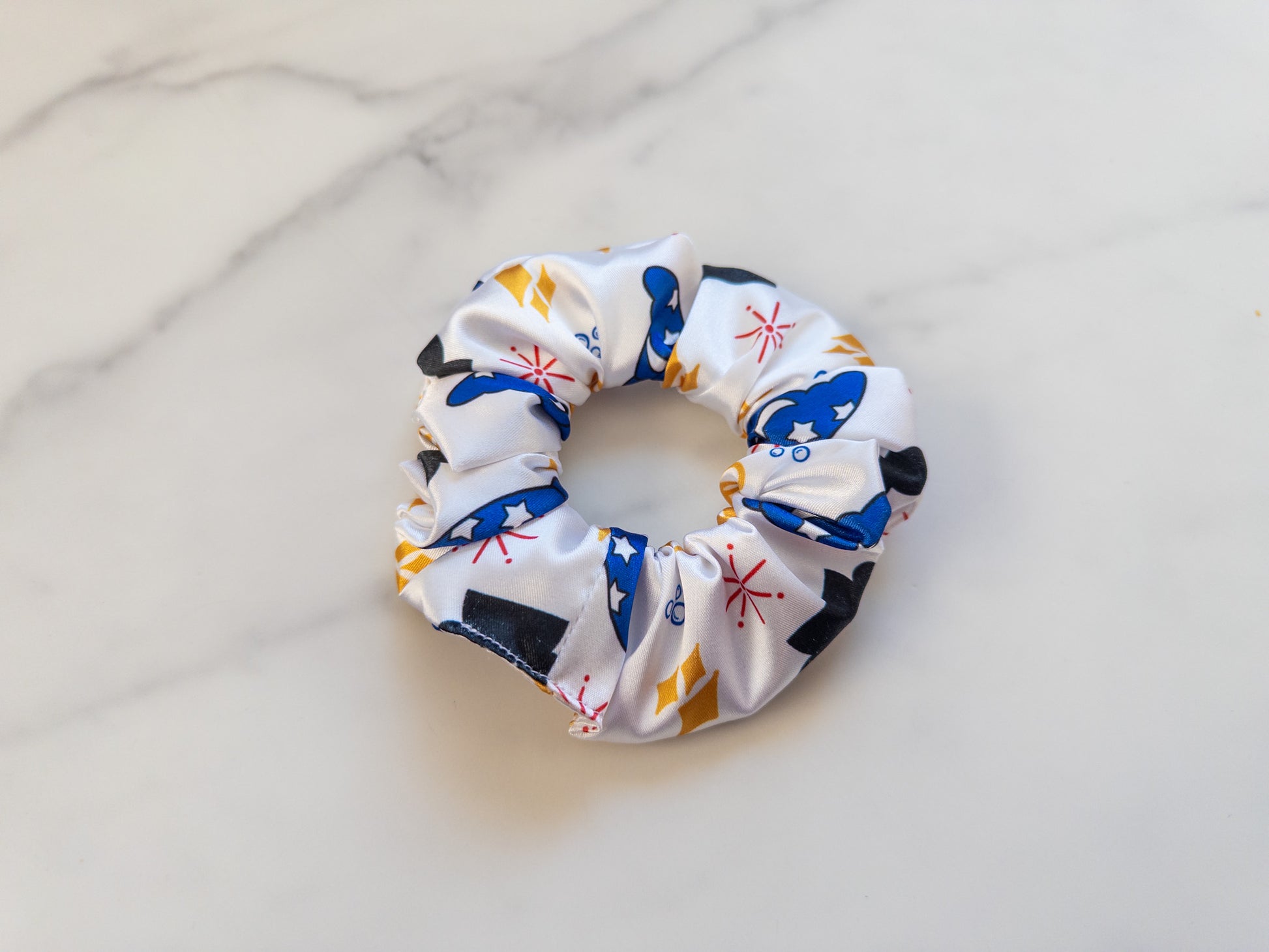 One (1) satin regular scrunchie. Placement of characters may vary on individual scrunchies.