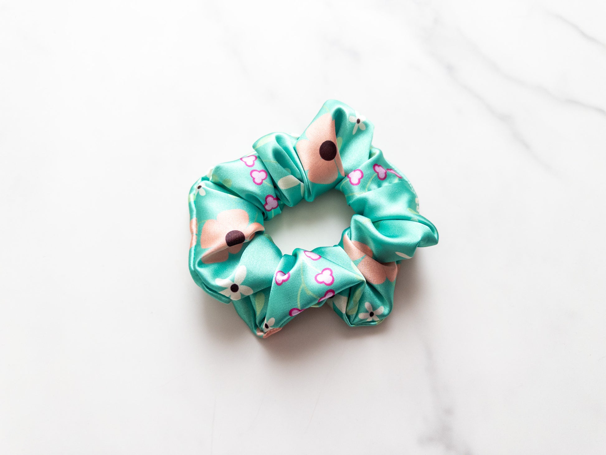 One (1) satin regular scrunchie. Placement of characters may vary on individual scrunchies.