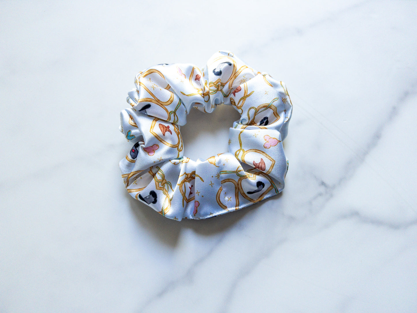 One (1) satin regular scrunchie. Placement of characters may vary on individual scrunchies.