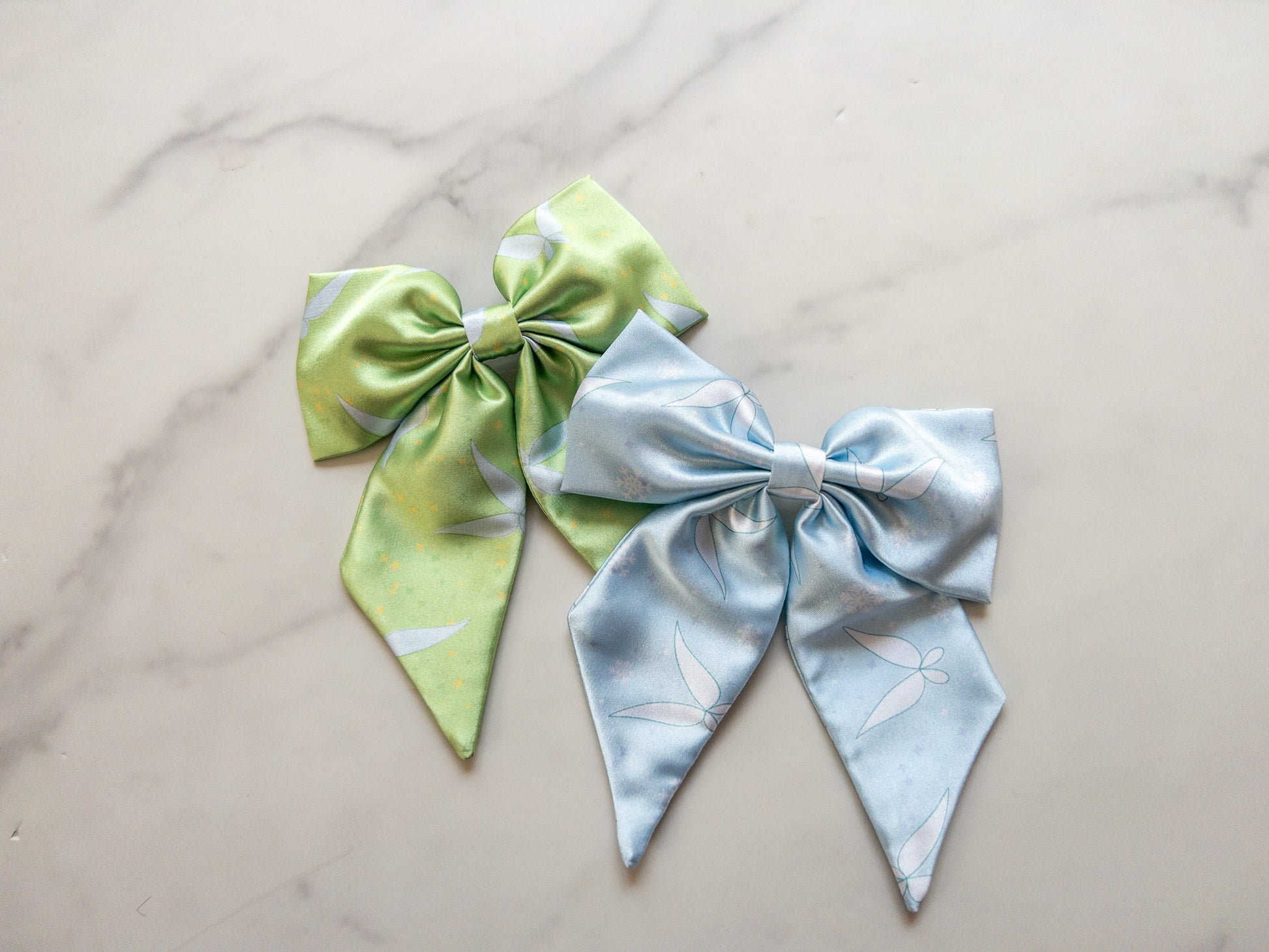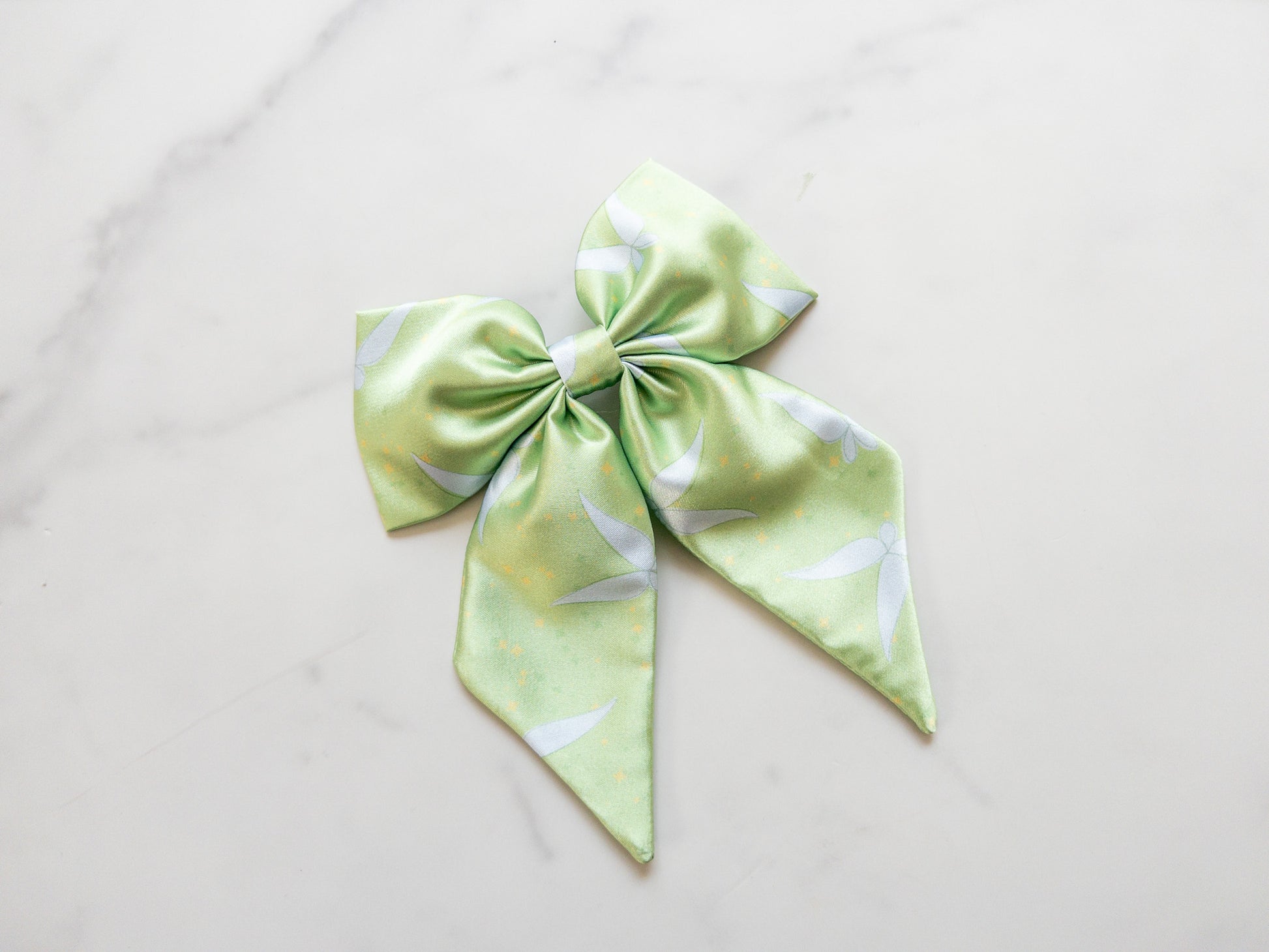 Bow is about 5.5 inches wide with tails. Back has a 3 inch barrette.