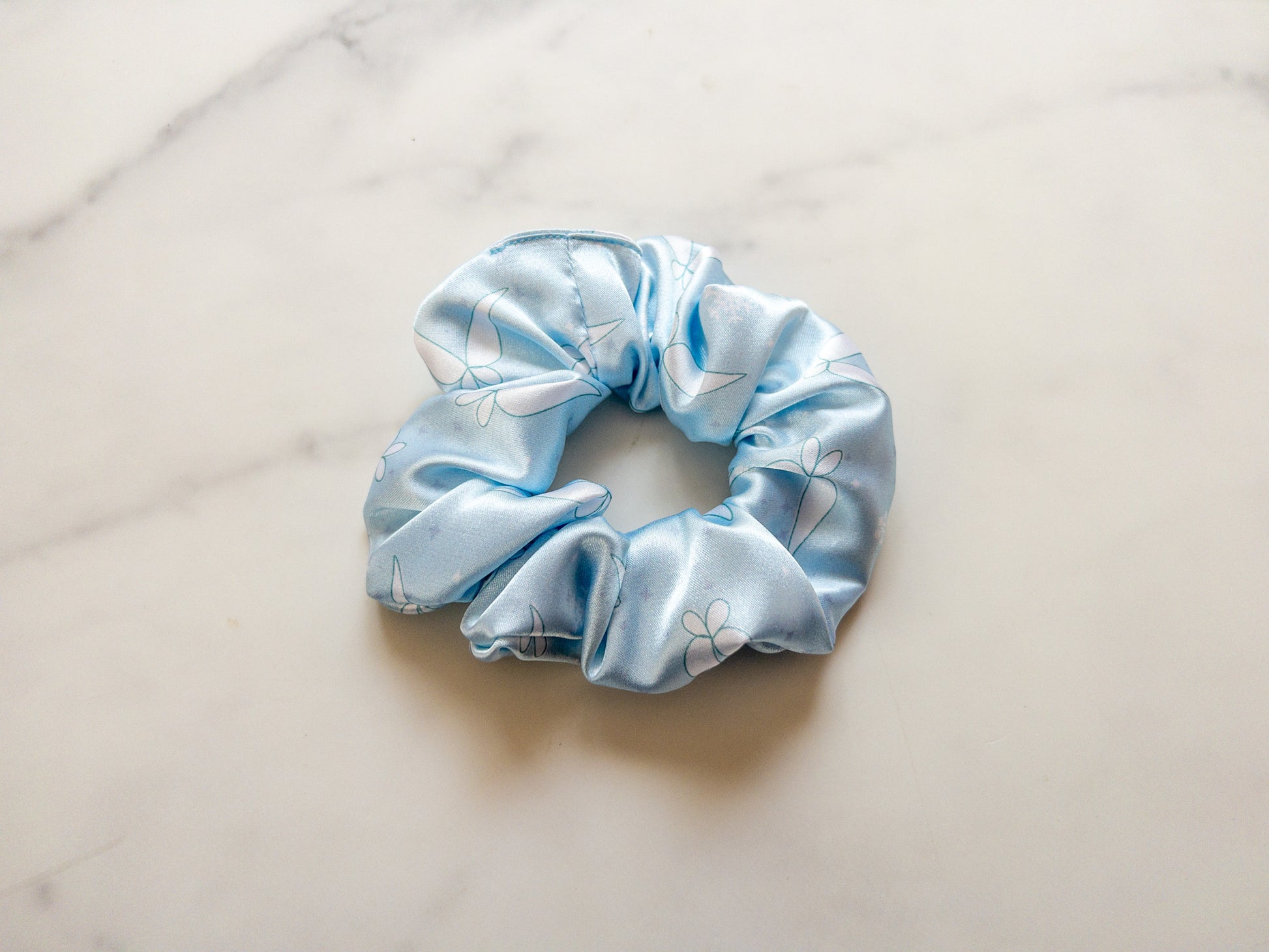 One (1) satin regular scrunchie. Placement of characters may vary on individual scrunchies.