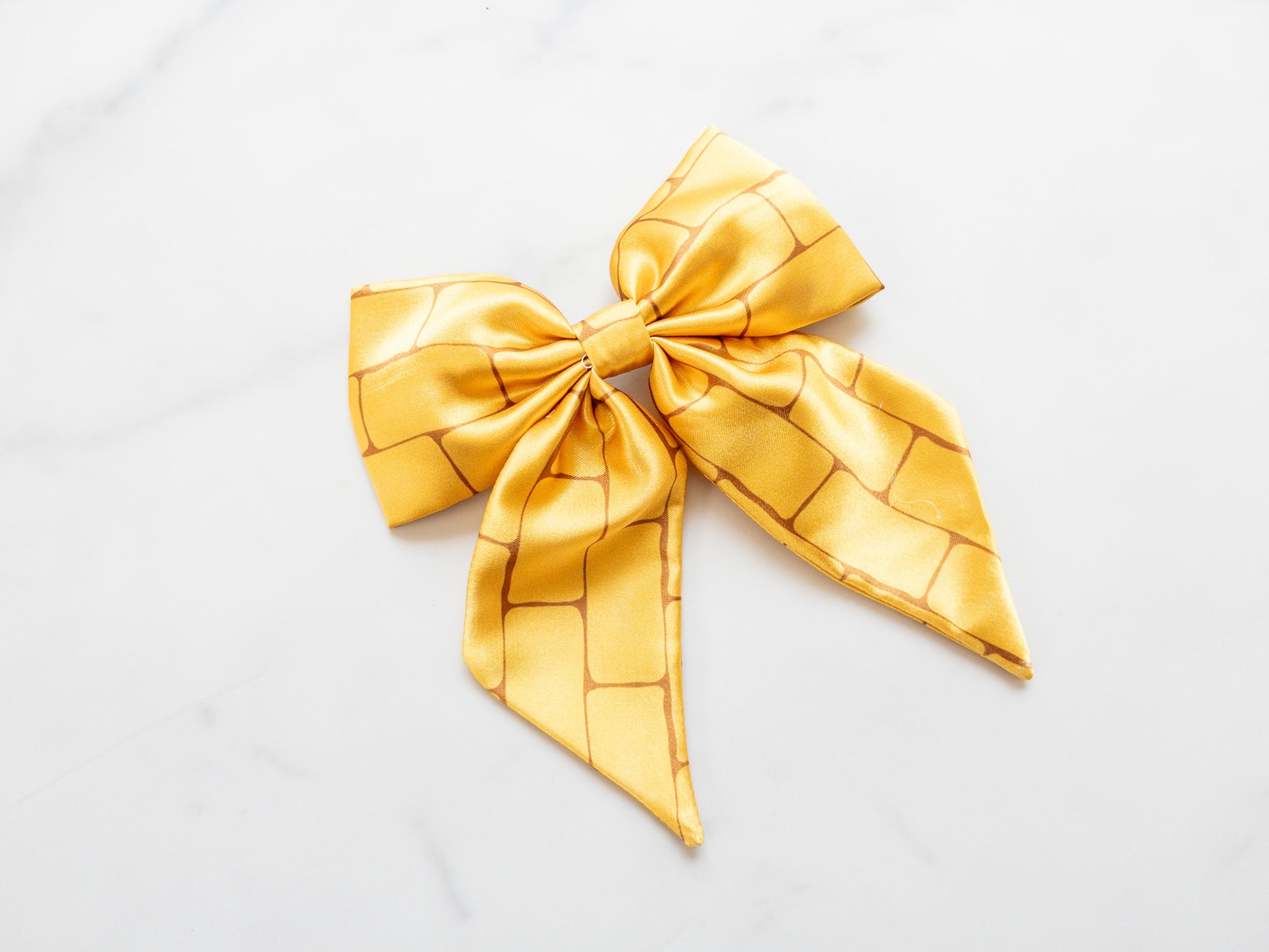 Bow is about 5.5 inches wide with tails. Back has a 3 inch barrette.