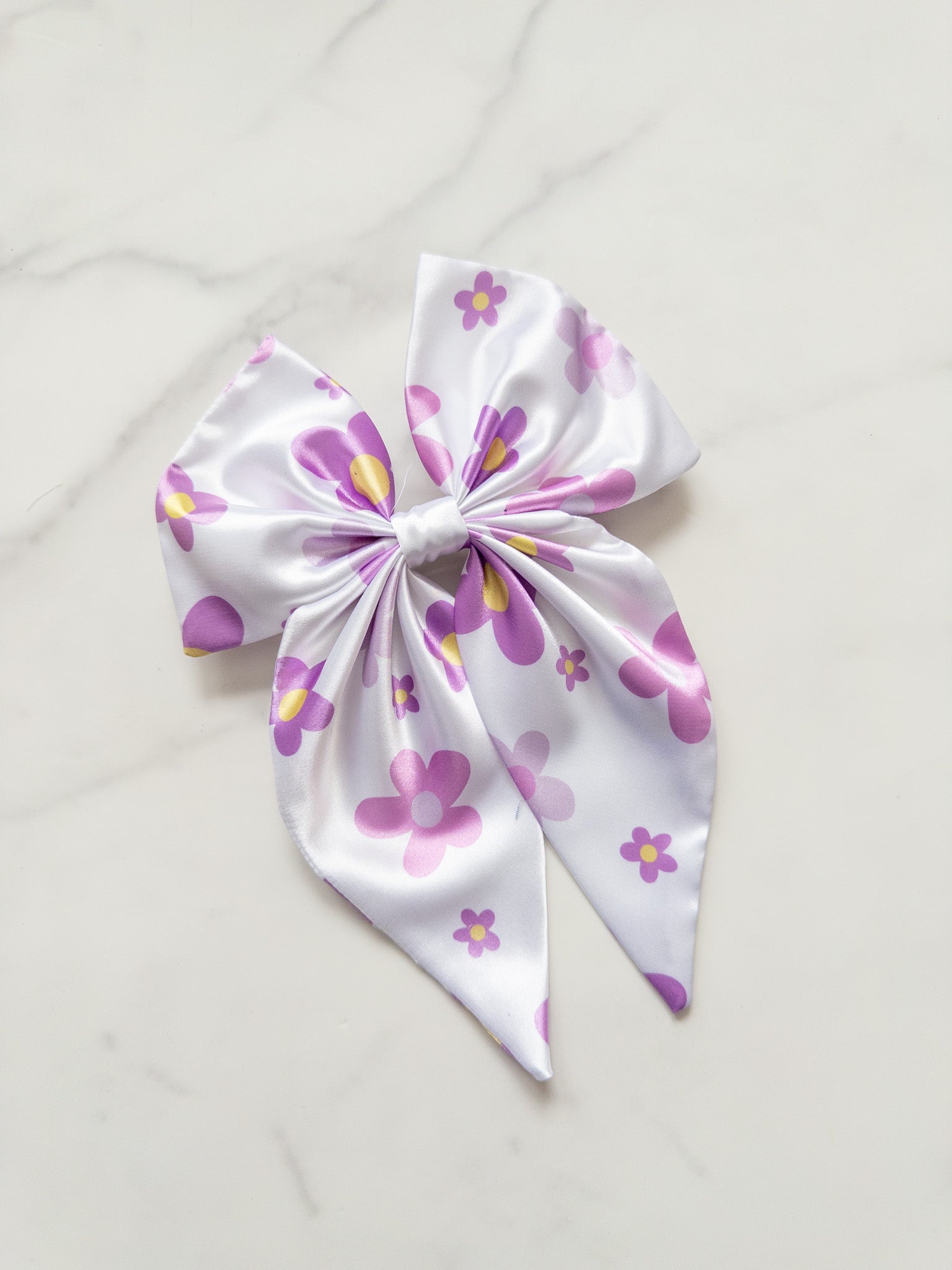 Large satin bow with 3 inch barrette on back. Bow is 6 inches wide and 9 inches long.