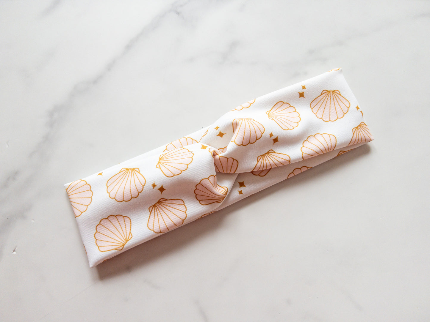 Stretch headband with twist. Headbands are about 18 inches in circumference and have a stretch to them. Headbands are 2.5 inches in width. Made from swim material. Character placement will vary on individual headbands.