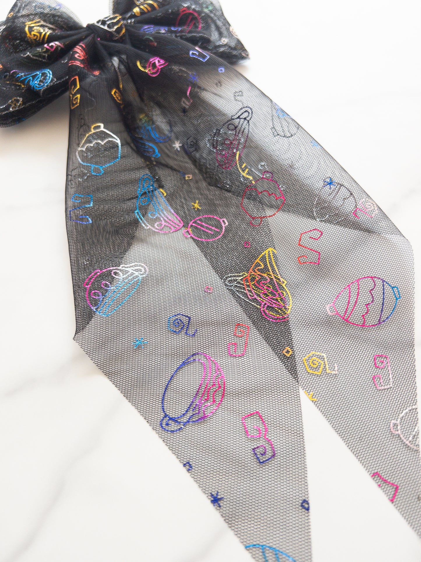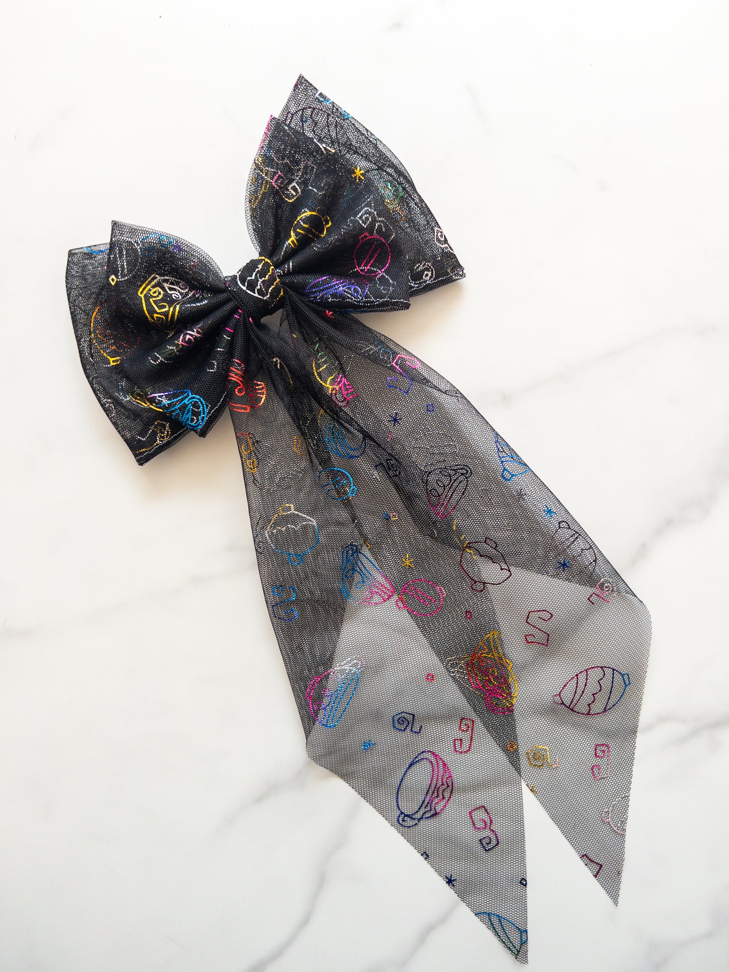 Tulle hair bow with a barrette. Bow is about 6.5 inches in width and 4 inches in height. Bow tails are about 11 inches in length from center of bow.