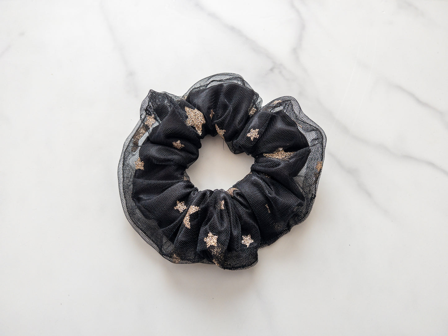 One (1) large double layer tulle scrunchie. Outer layer is tulle and inner layer is satin. Satin layer is about the size of standard scrunchie. Placement of characters may vary on individual scrunchies.