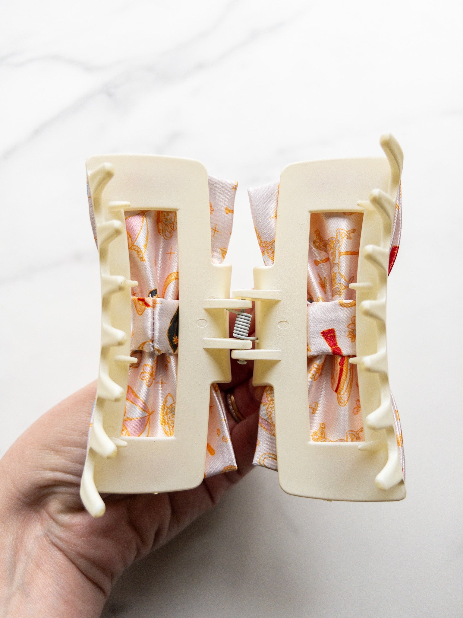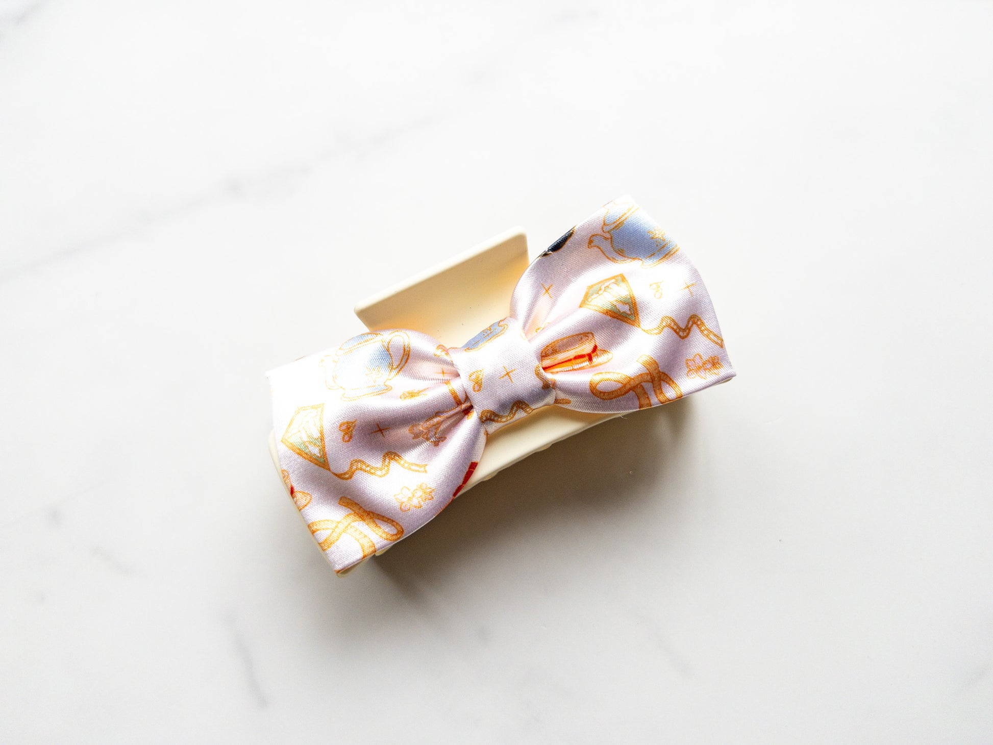 4 inch claw clip with satin bow. Bow is on both sides of claw clip.