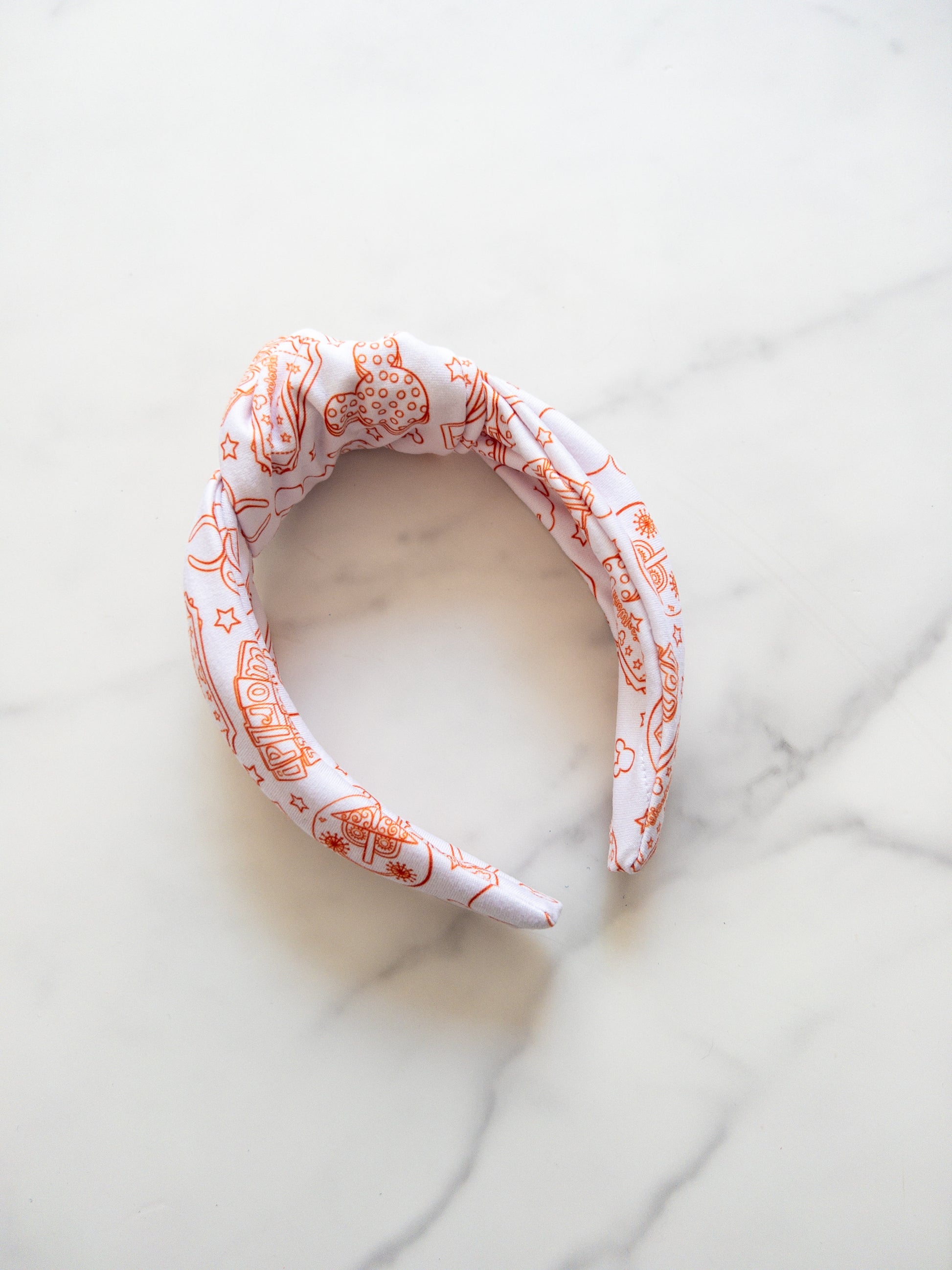 Adult top knot headband. Fabric is double brushed polyester and there is a plastic headband inside. Fits adults best but can fit larger children as well.