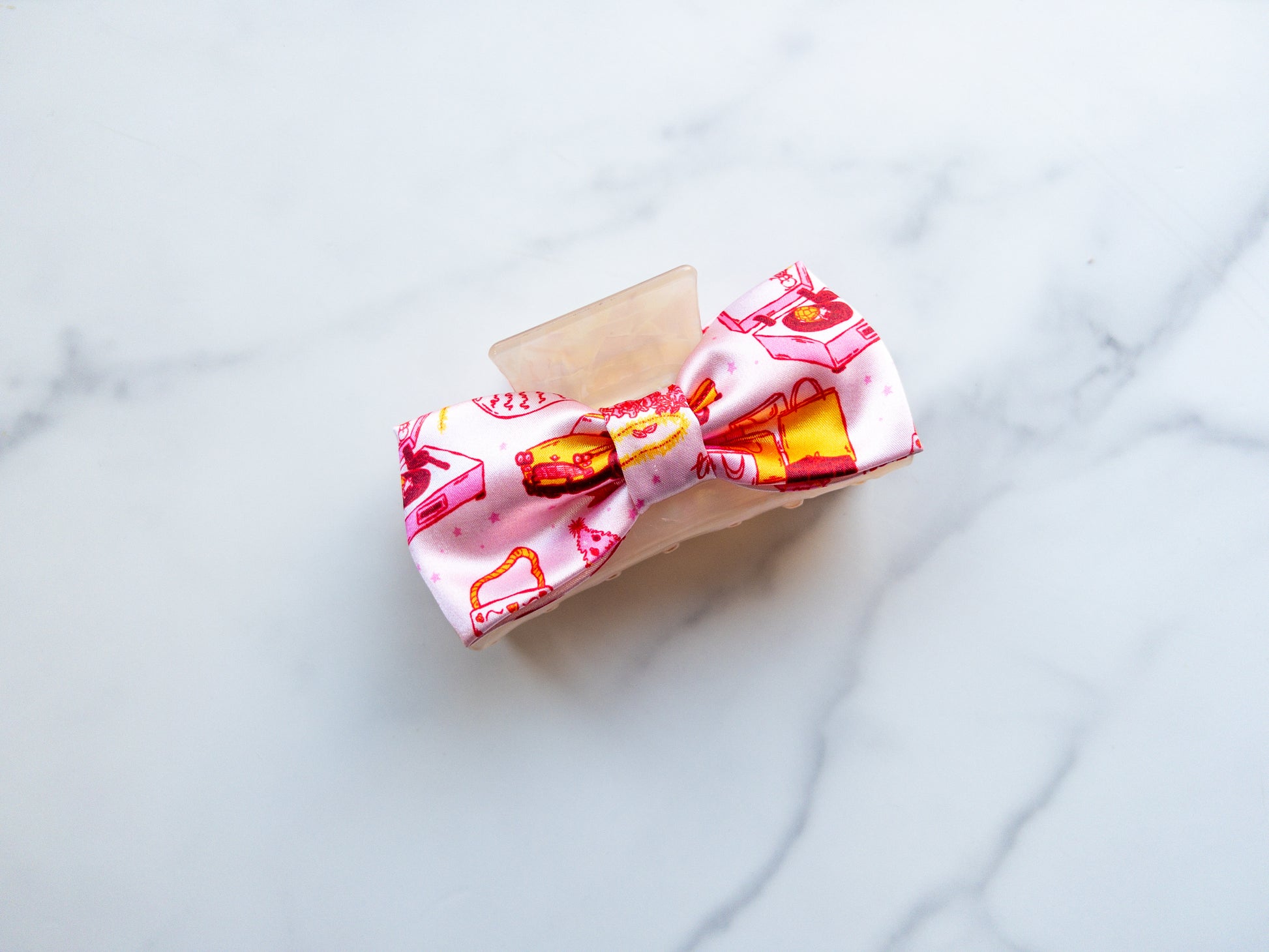 4 inch claw clip with satin bow. Bow is on both sides of claw clip.