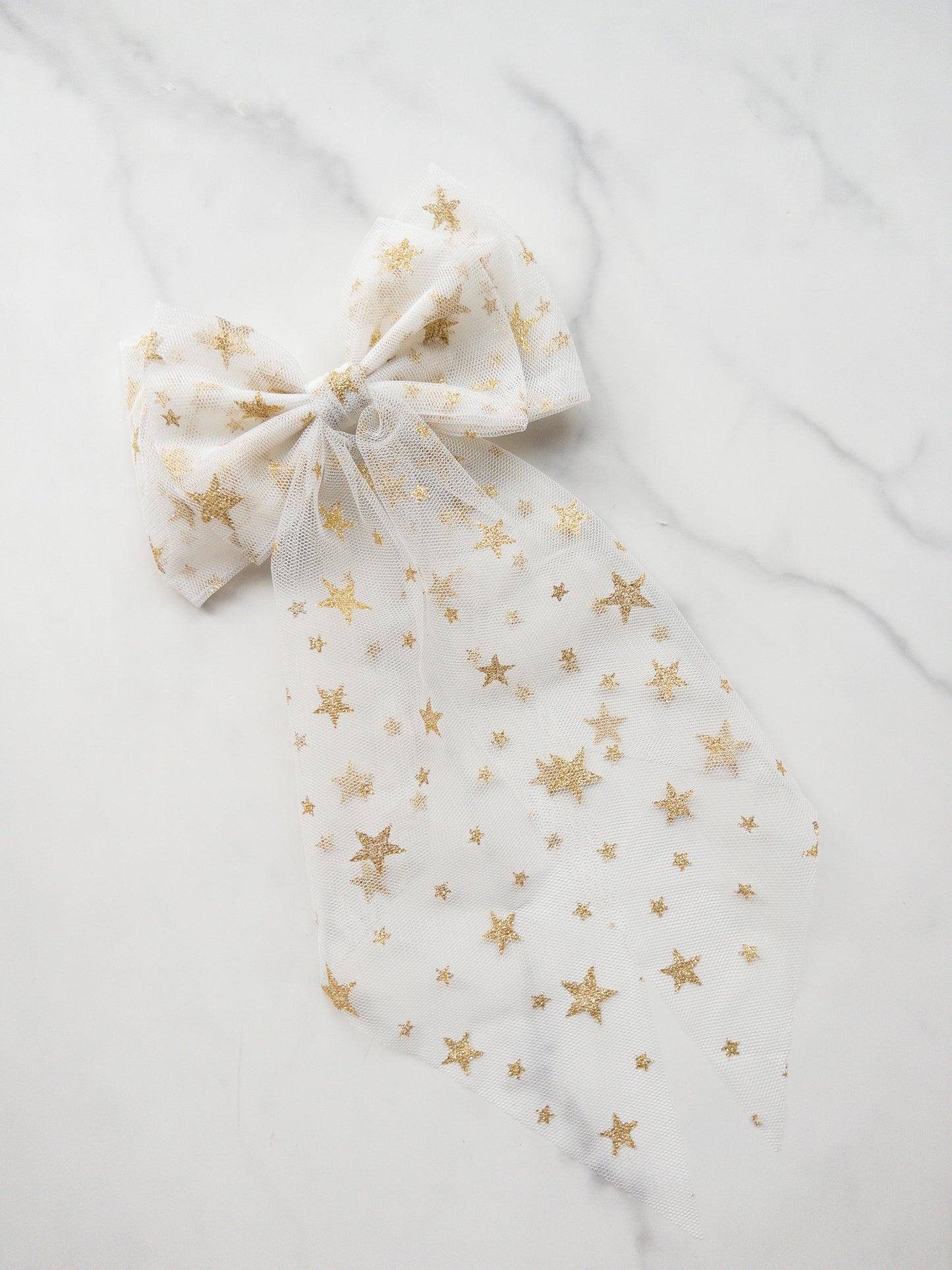 Tulle hair bow with a barrette. Bow is about 6.5 inches in width and 4 inches in height. Bow tails are about 11 inches in length from center of bow.